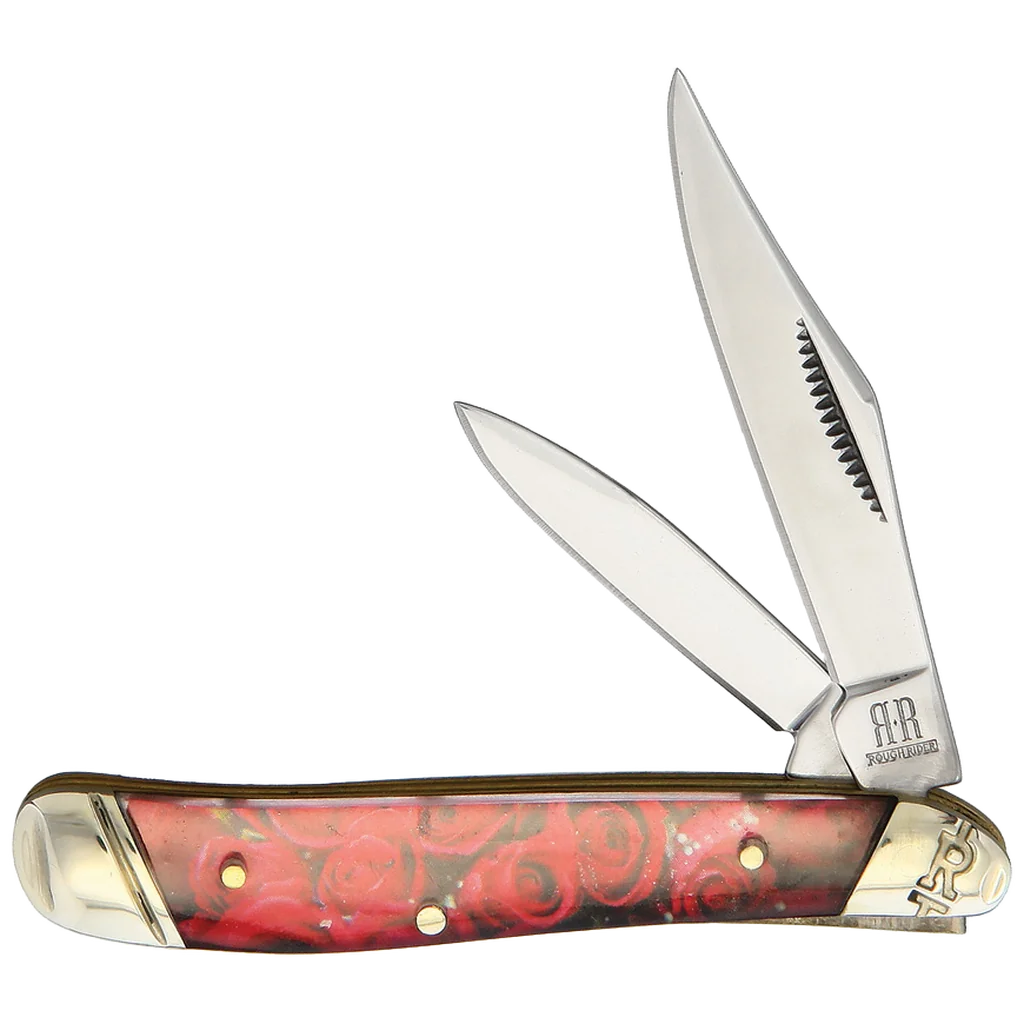 All the knives in the Rough Ryder Wild Flowers Series feature mirror polished 440A blades with half stops and nail nick pulls. The handles are acrylic with full color floral art, nickel silver pins, brass liners, and embossed nickel silver bolsters. This Wild Flowers series Peanut has a 2.25" clip point, and 1.62" pen blade. The handles feature eye-catching red roses. When closed the knife measures 2.87".