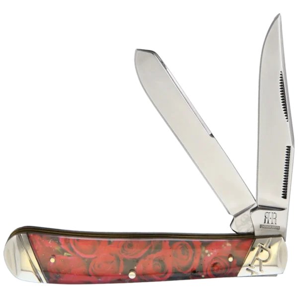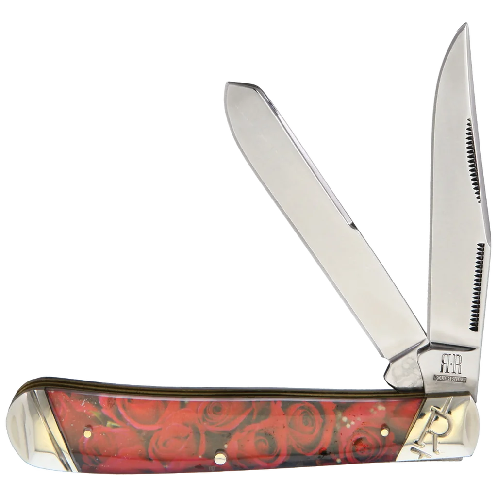 All the knives in the Rough Ryder Wild Flowers Series feature mirror polished 440A blades with half stops and nail nick pulls. The handles are acrylic with full color floral art, nickel silver pins, brass liners, and embossed nickel silver bolsters. The Rough Ryder Red Roses Trapper consists of two non-locking blades – a 3.27" Clip point, and a 3.25" Spey blade. When closed the knife measures 4.12".