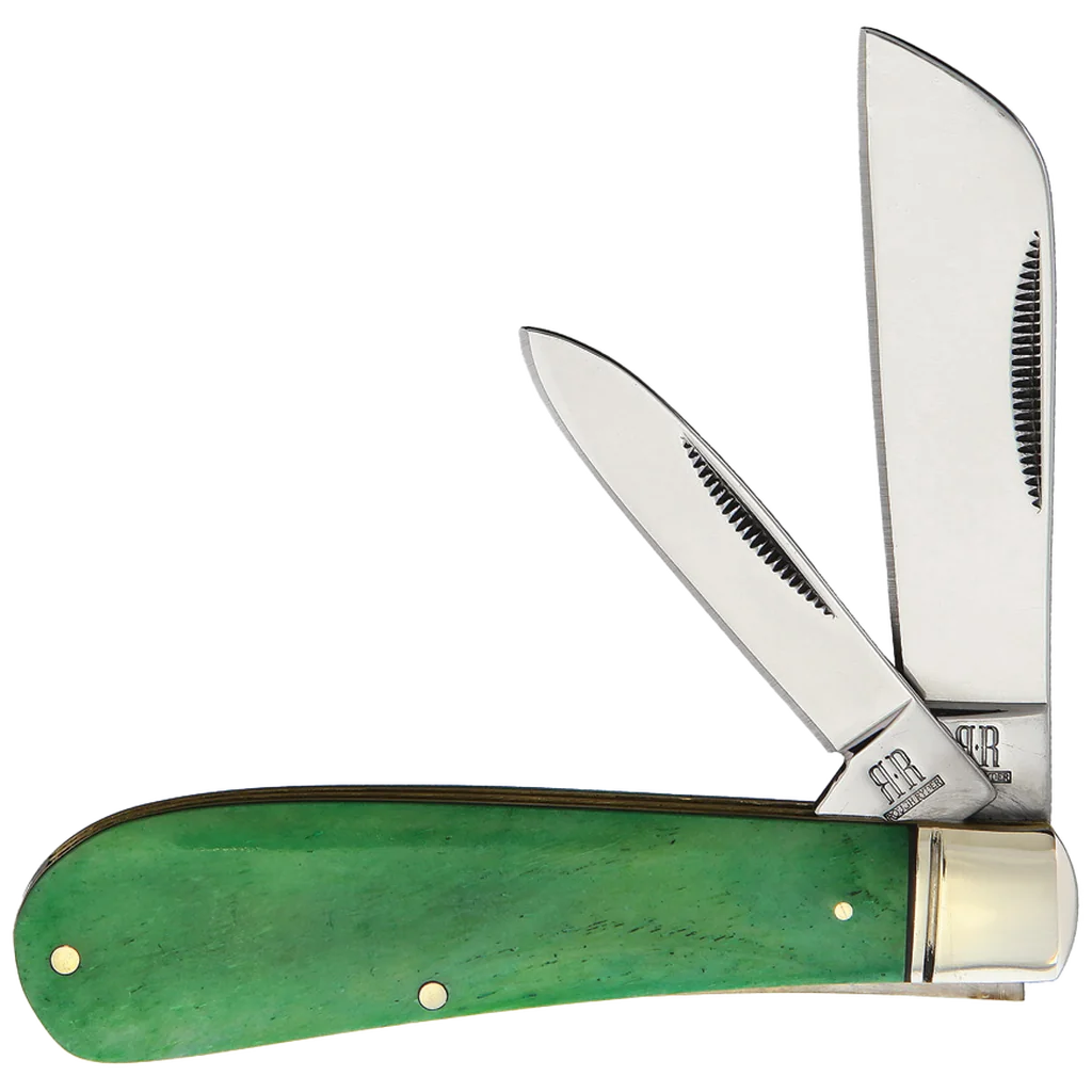 All the knives in the Rough Ryder Working Man Pocket Clip series feature 440 stainless steel blades with half stops, match strike pulls, and a polished finish. The handles are green smooth bone with black underliners, brass pins and liners, nickel silver ringed bolsters, and a tip-down pocket clip. The Rough Ryder Working Man Pocket Clip Half Hawk features a 2.5" sheepsfoot blade and a 2" spear point blade. It’s 3.87" closed and weighs 3.81oz.