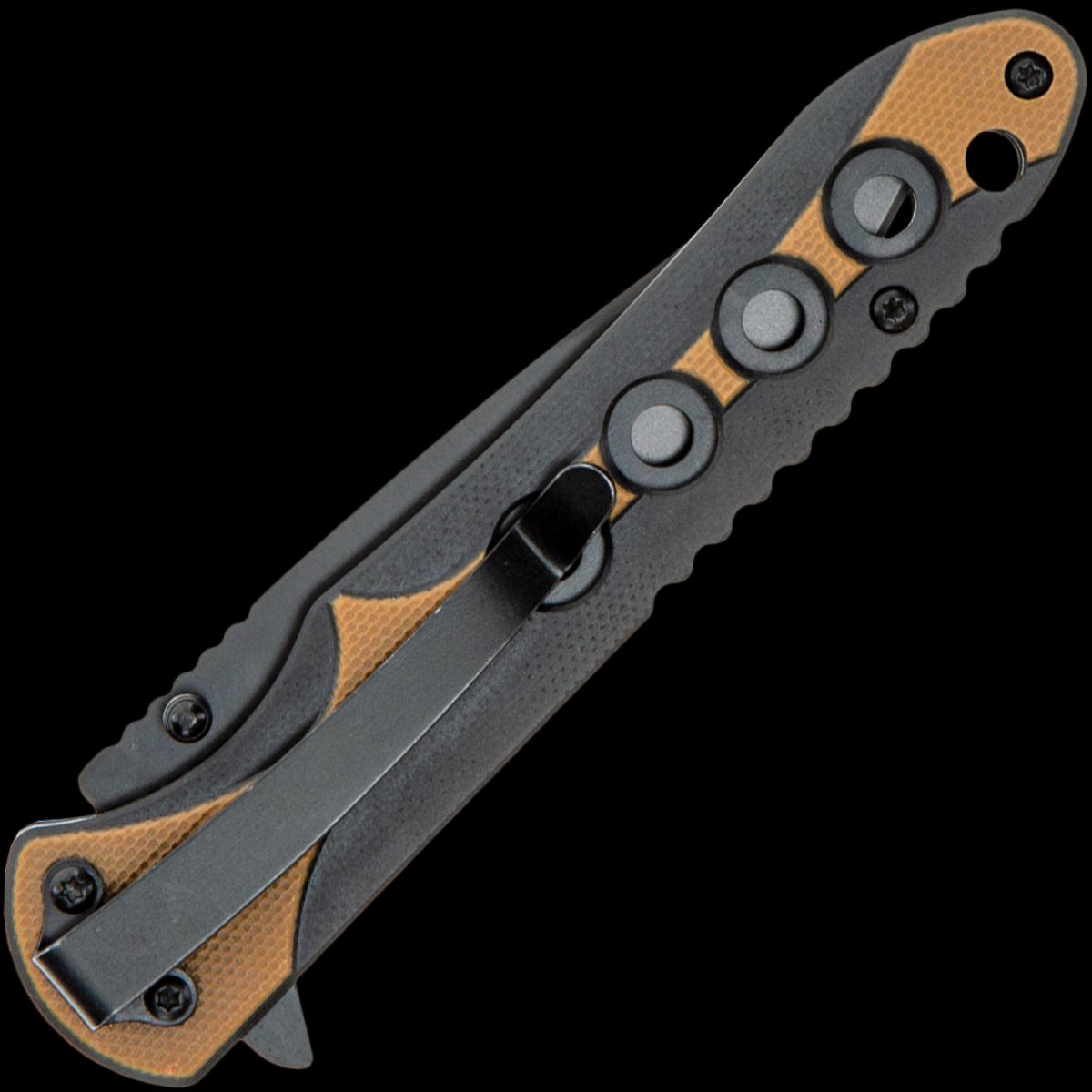 This flipper knife from Schrade utilizes their Ultra-Glide pivot system to provide a smooth and fast opening of the knife. This speedy opening is facilitated by an integrated flipper tab and dual thumb studs. The 3Cr13 stainless blade has a drop point shape and is black oxide coated to protect the blade while in use. The slim handles are made from black and tan G10 and conform nicely to your hand.