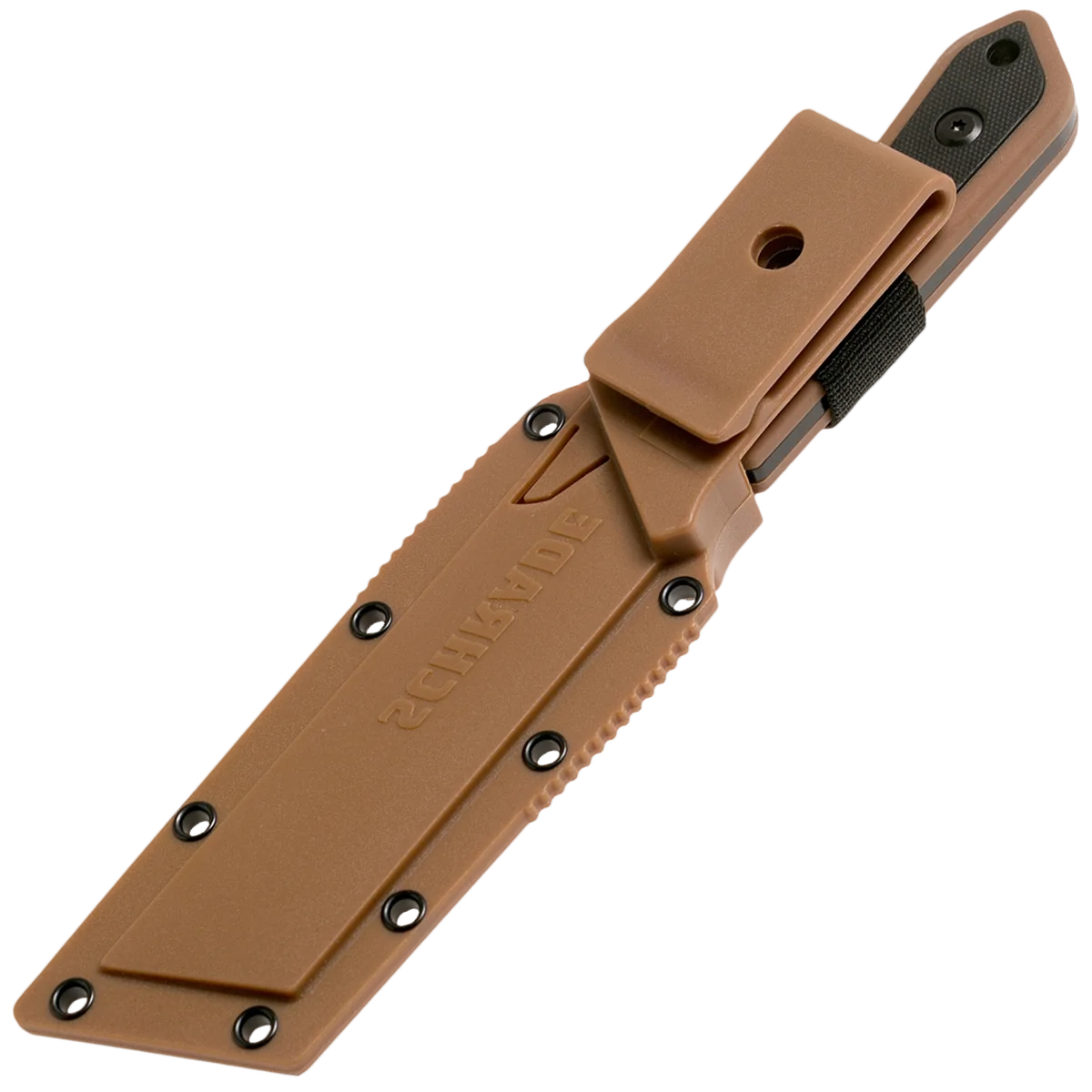 This knife from Schrade brings the style of a cleaver folder to the fixed blade realm. The 4.25" 3Cr13 stainless blade has a nice finger choil for choking up on and is black oxide coated to protect the blade while in use. The handles are made from a black and tan GFN and conform nicely to your hand. The blade features a large choil to accommodate several grip types such as choking up on the blade for small knife work. It comes with a hard polymer sheath.