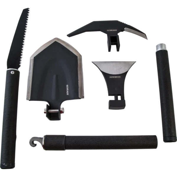 - Six piece outdoor kit all made from 3Cr13MoV stainless steel. This six piece set includes a axe head, shovel, pickaxe, saw and handle extension! Both handles are constructed from stainless steel with a textured silicone wrap. Also included is a polyester case to easily transport/store this outdoor kit no matter where you go!