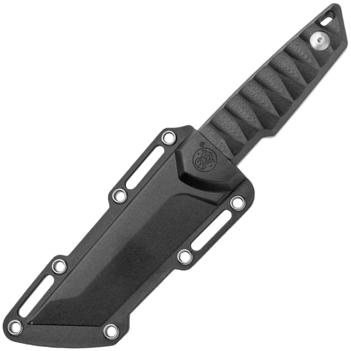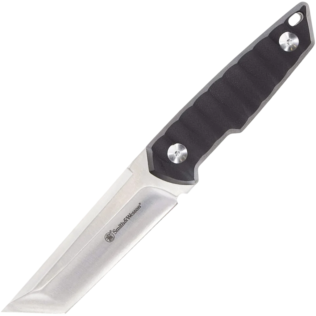 The Smith & Wesson 24/7 Fixed Tanto features a 4" 8Cr13MoV stainless steel tanto blade with a satin finish. This full tang fixed blade has a textured black G-10 handle with stainless steel hardware. It's 8.5" overall and weighs 6.08oz. Includes a black molded nylon sheath with belt loop.