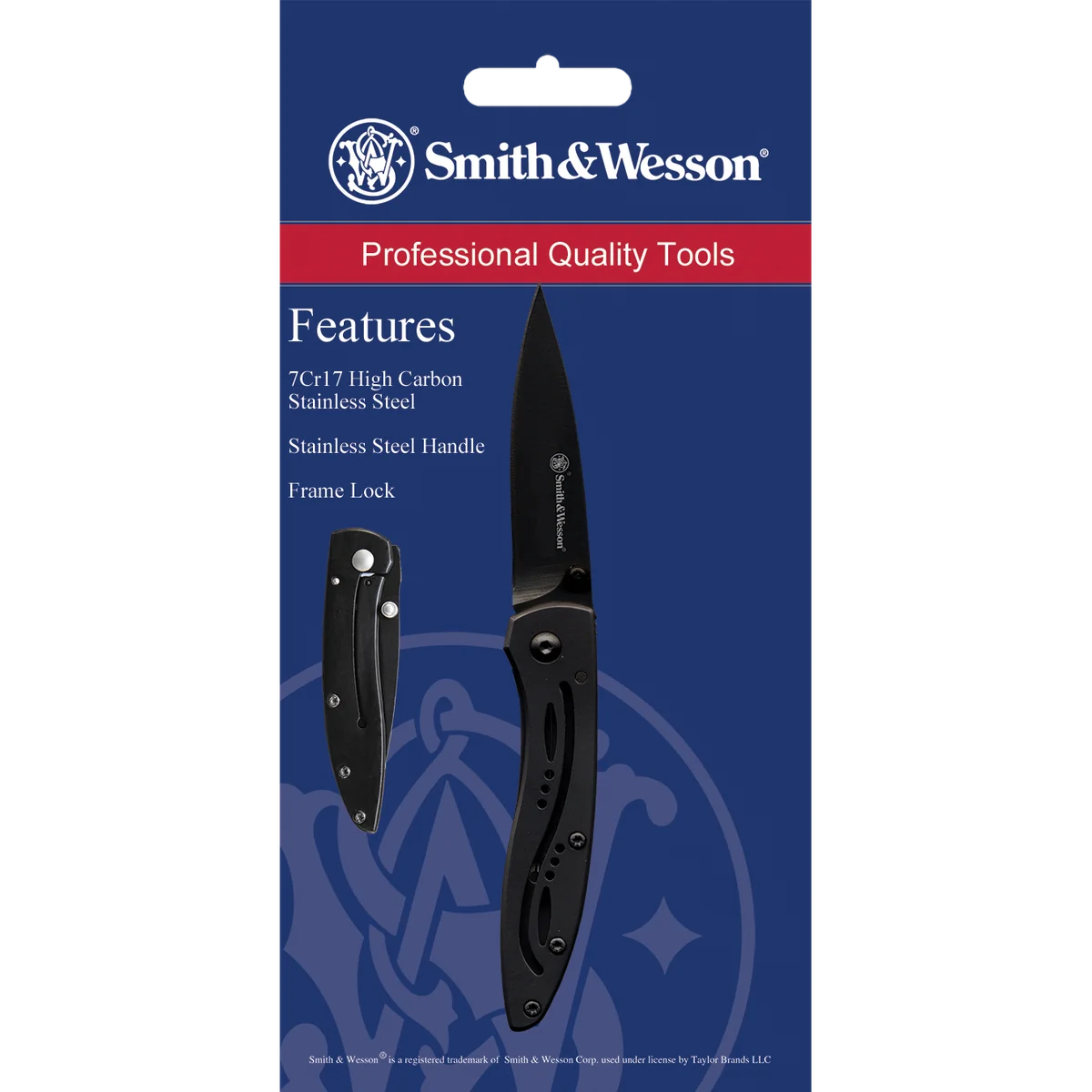 - Folding 7Cr17MoV stainless steel black oxide plain drop point blade with black stainless steel handles. Also features a frame lock mechanism and pocket clip.