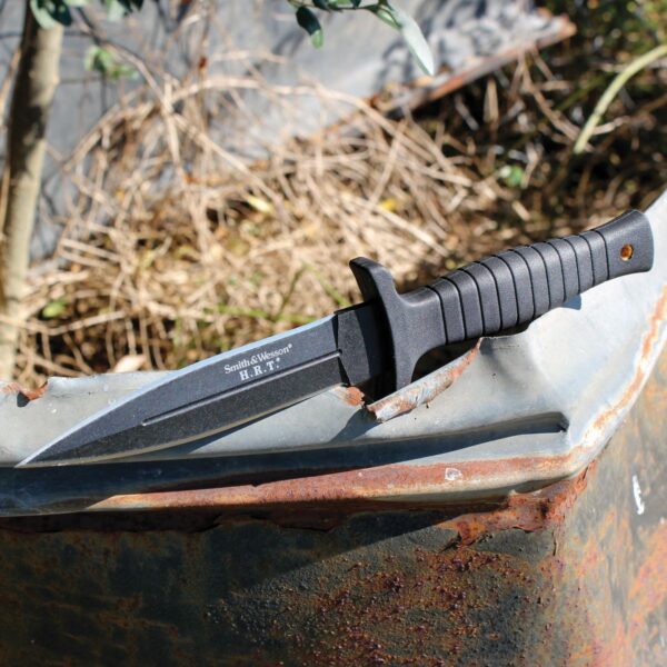 The SWHRT9B Boot knife fixed blade is part of Smith and Wesson’s H.R.T line of knives. The HRT 9 is a great boot knife that features a black oxide finished 7Cr17MoV stainless steel dagger blade with sharpened edges. The handle has a ribbed rubber grip with an over-sized guard so you can keep your hand set in even the most demanding situations. The included leather sheath has button closure and a steel clip for carry.