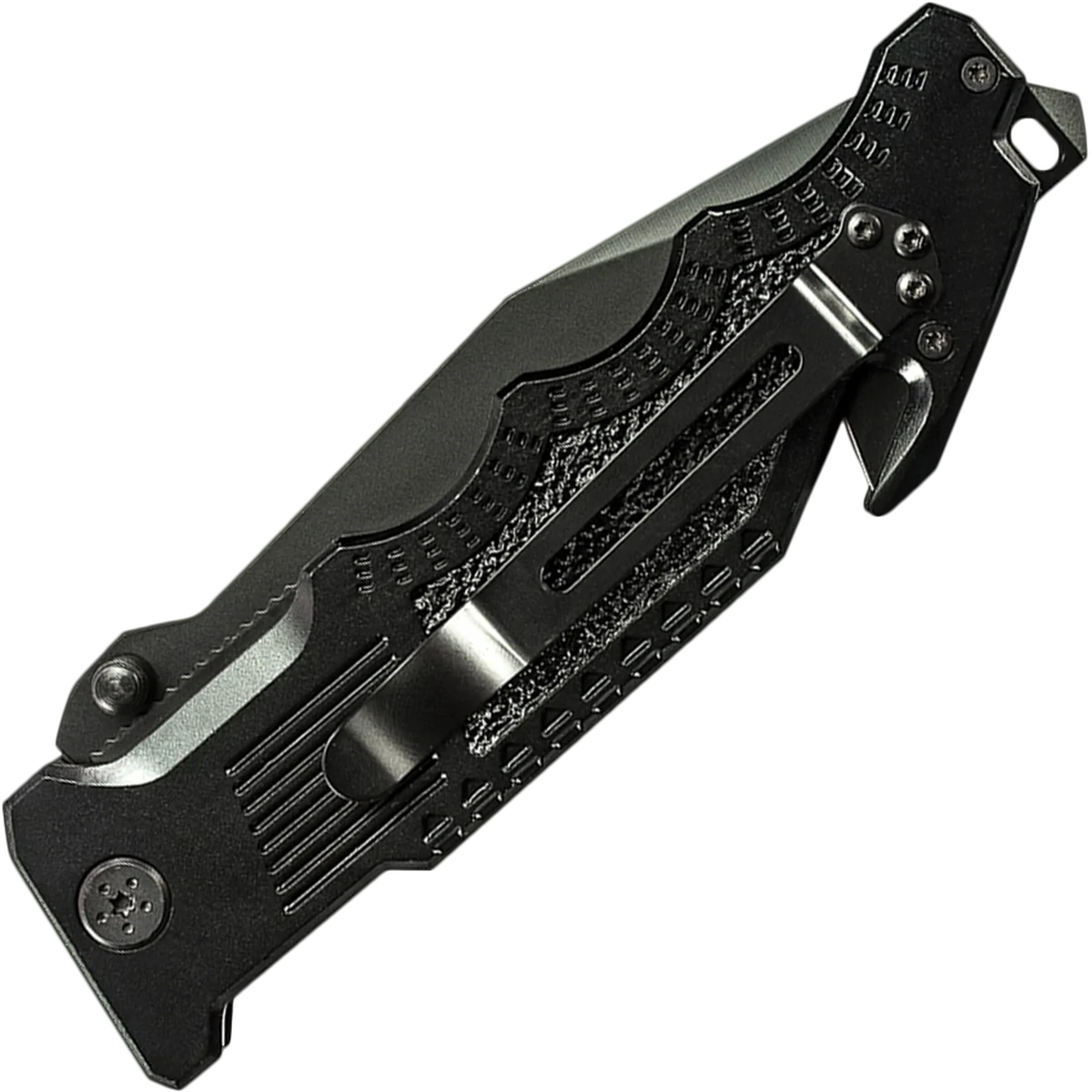 - Folding 7Cr17MoV stainless steel black oxide finished plain tanto blade with black aluminum handles. Also features a liner lock mechanism, pocket clip, glass breaker, seatbelt cutter and lanyard hole.