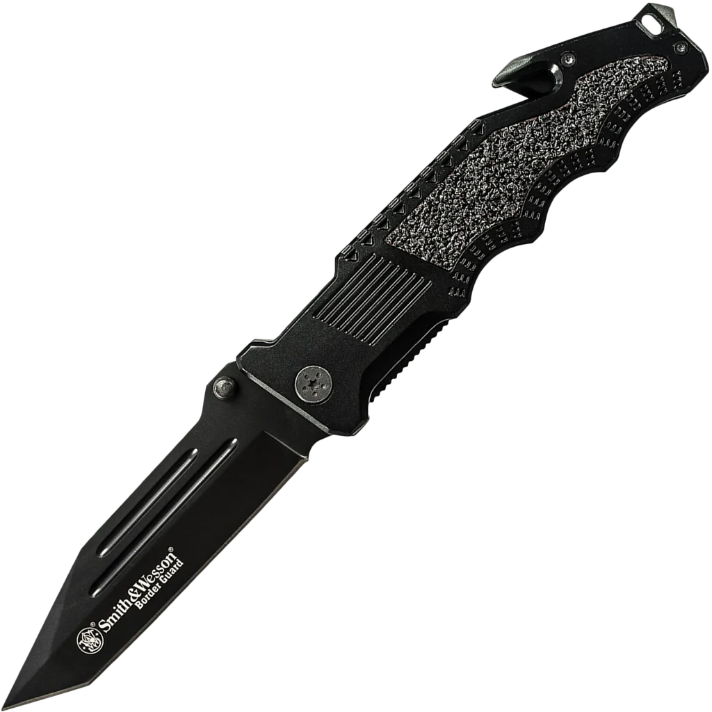 The Smith & Wesson Border Guard Knife, model SWBG2T, features a 7Cr17MoV stainless steel black tanto point blade. This big and beefy manual folder is designed for heavy duty cutting. Built with a 4.4" blade with a black oxide coat, the blade is ready to do some serious cutting. The blade has dual thumb studs and is sharp right out of the box. The handle is heavy duty aluminum with steel liners. The handle features a window breaker at the base and a strap cutter on the spine which makes it a great tool for anyone.