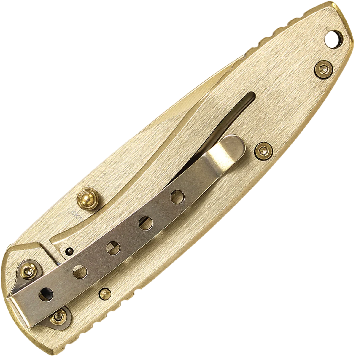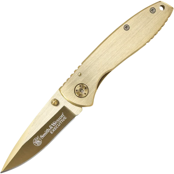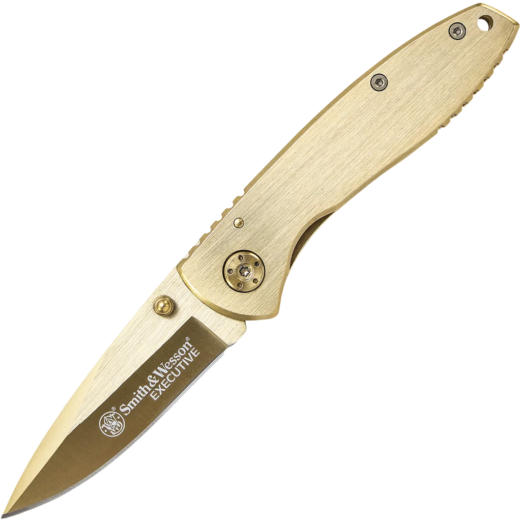 The Smith & Wesson Executive is a classy knife line with gold titanium finished 7Cr17MoV stainless steel construction. The CK110GL has a gold finished modified drop point blade with a plain edge and ambidextrous thumb stud for simple one-hand opening. The frame lock handle design has solid lockup and a slim, sleek design. The handle edges are notched as seen in the pictures for increased grip and comfort. The Executive comes with a gold finished pocket clip for tip-down carry.