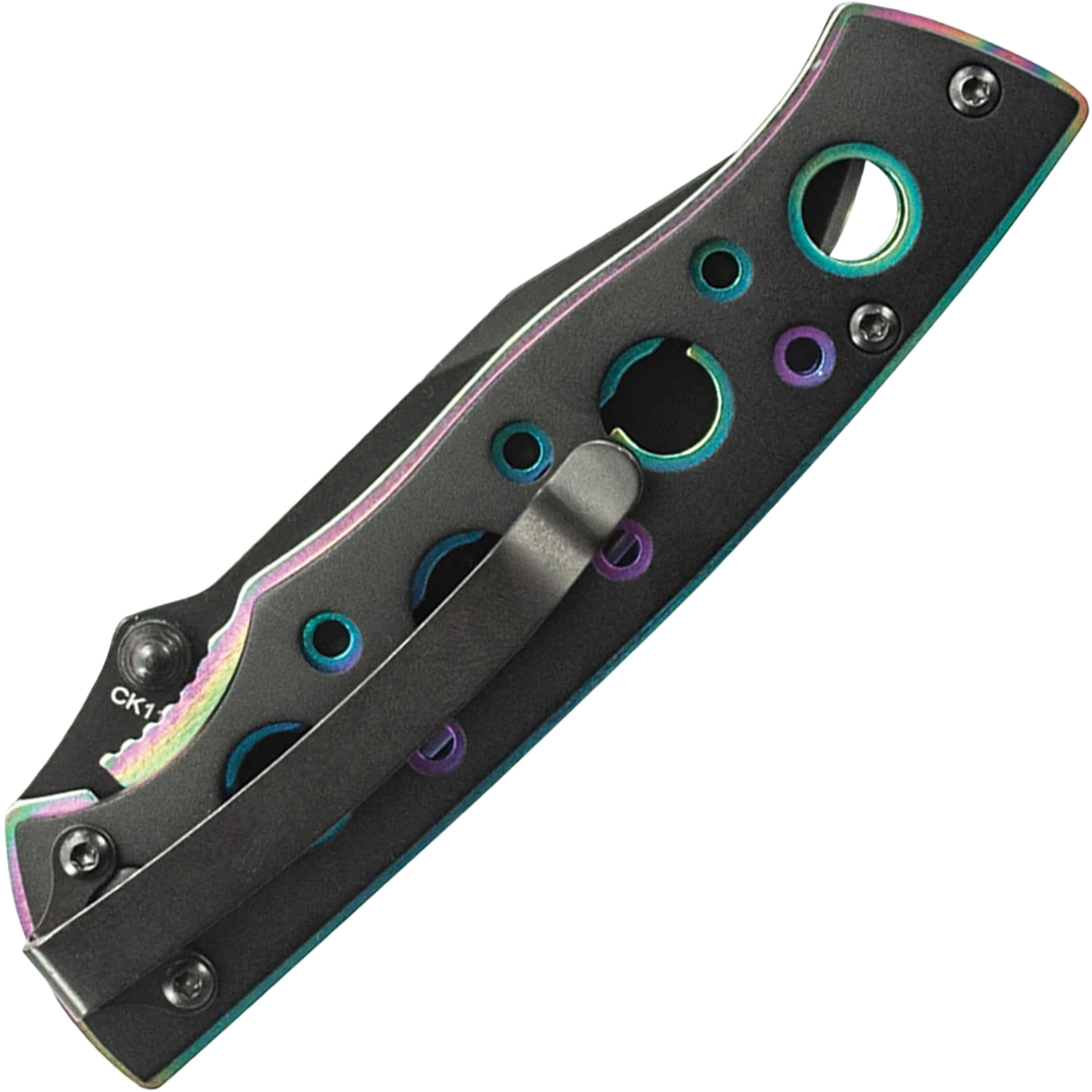 - 7Cr17MoV folding clip point blade with a black oxide finish. Black aluminum handles with multi coloured stainless steel liners with a liner lock mechanism to ensure a securely locked blade.