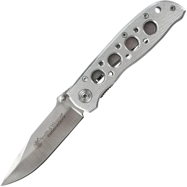 The Extreme Ops CK105H knife handles your daily cutting chores with ease, while making you look good. A silver and black aluminum handle with drilled holes keeps the overall weight down and a turned diamond texture provides grip. Its Satin finished modified drop point blade is quick to attention with the thumb stud opener, and a steel liner lock tab ensures solid lockup. The black stainless steel pocket clip is mounted for tip-down carry.