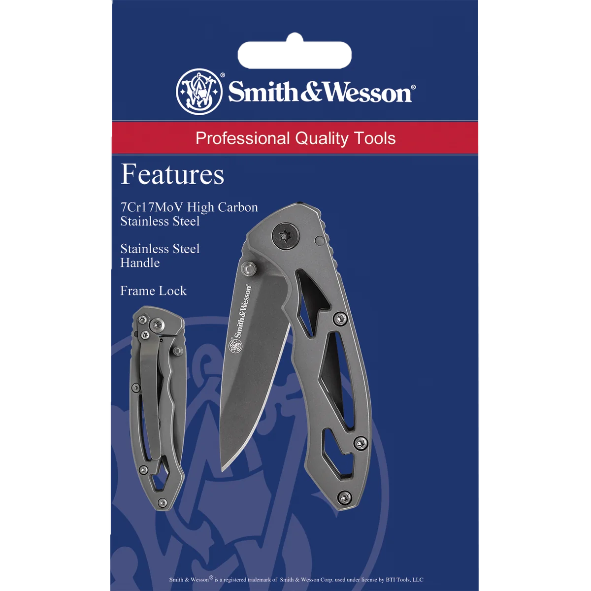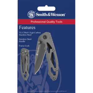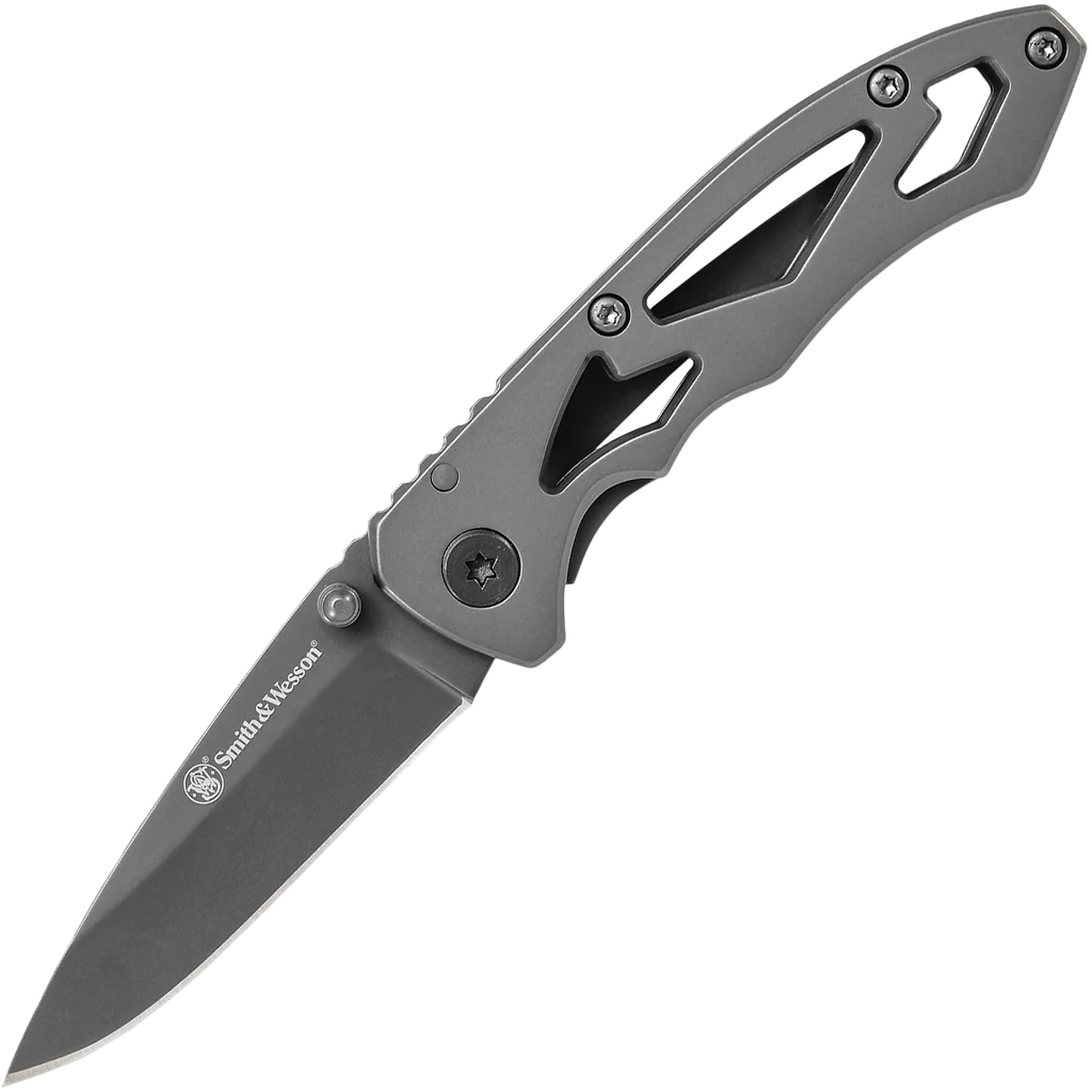 Using the right sized tool for the job really does matter. This Smith & Wesson folding knife, for example, is the perfect size for all your daily tasks. The blade is a gray coated 7Cr17MoV high carbon stainless steel, so it's ready to tackle bigger jobs on a day-to-day basis without giving in to fatigue. The drop point blade features ambidextrous thumb studs for easy opening, and the frame lock ensures the blade stays in place while it's in use. The skeletonized handles keep the weight and bulk of this knife under control so it's easy to carry with you everywhere. And to make that even easier, it's got a right hand, tip-down pocket clip on the back