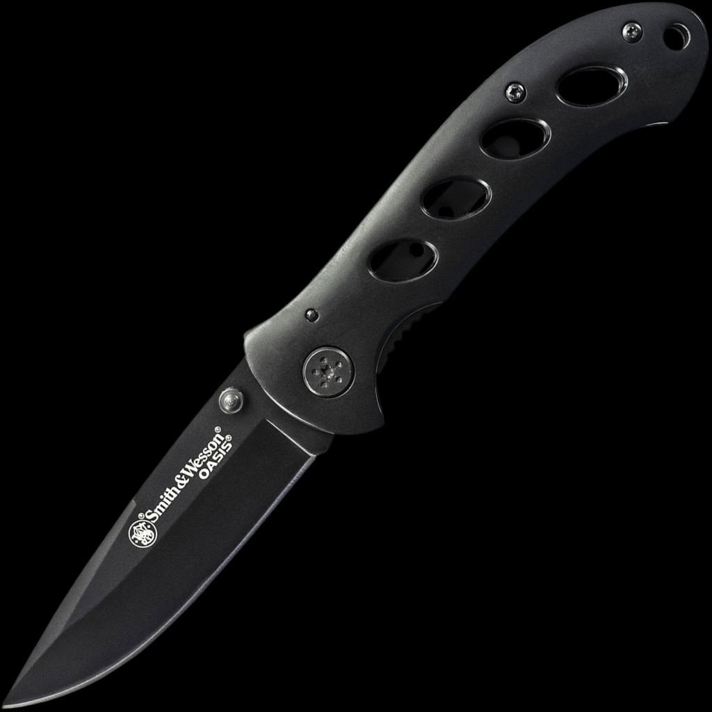 The Oasis by Smith & Wesson is a small folding knife that you can take with you for any job. With its 3.2" 7Cr17MoV plain blade, this knife is capable of any task. Features an all black oxide finish. The skeletonized stainless steel handles make this a light carrying knife. Dual thumb studs make for easy open while the pocket clip allows for convenient carry.