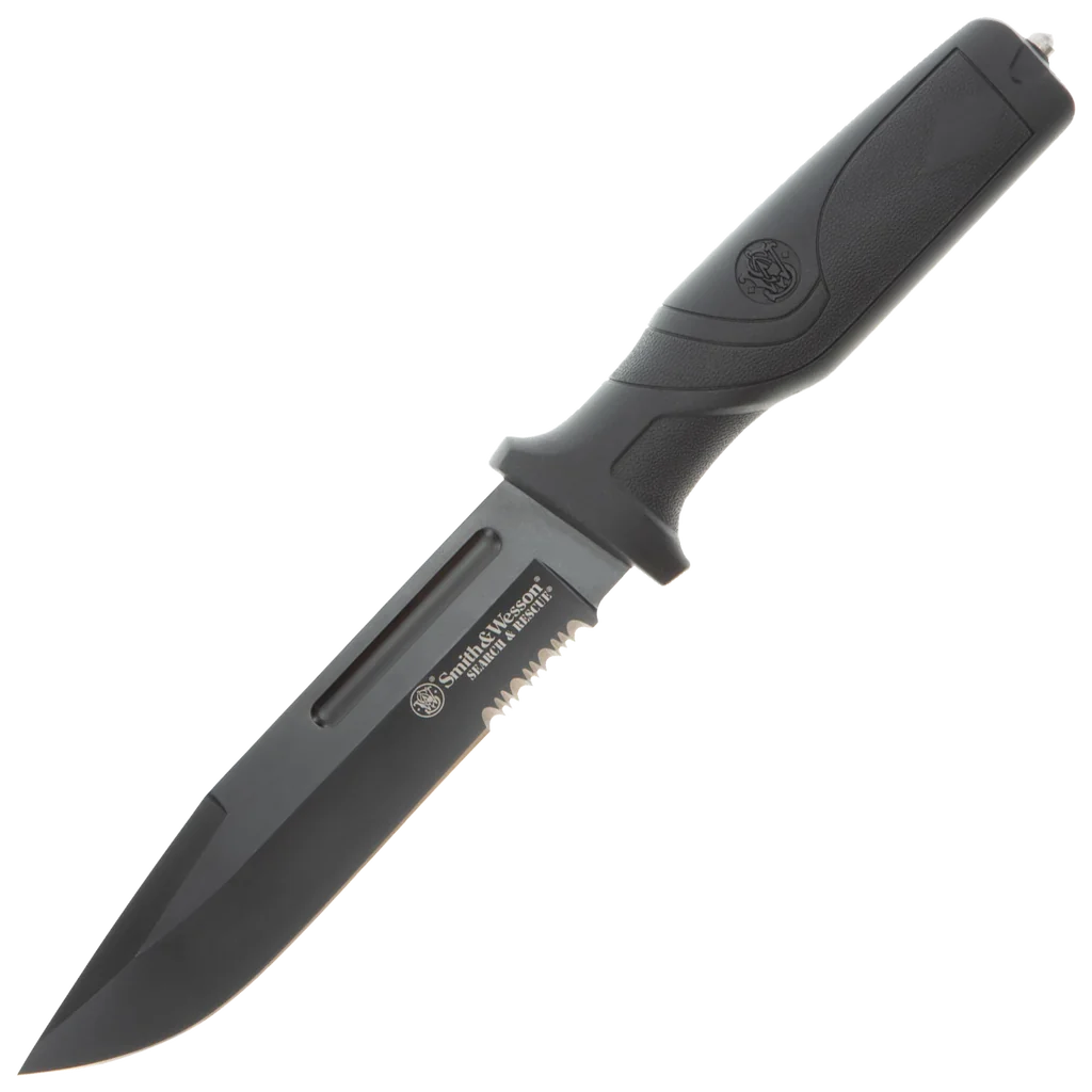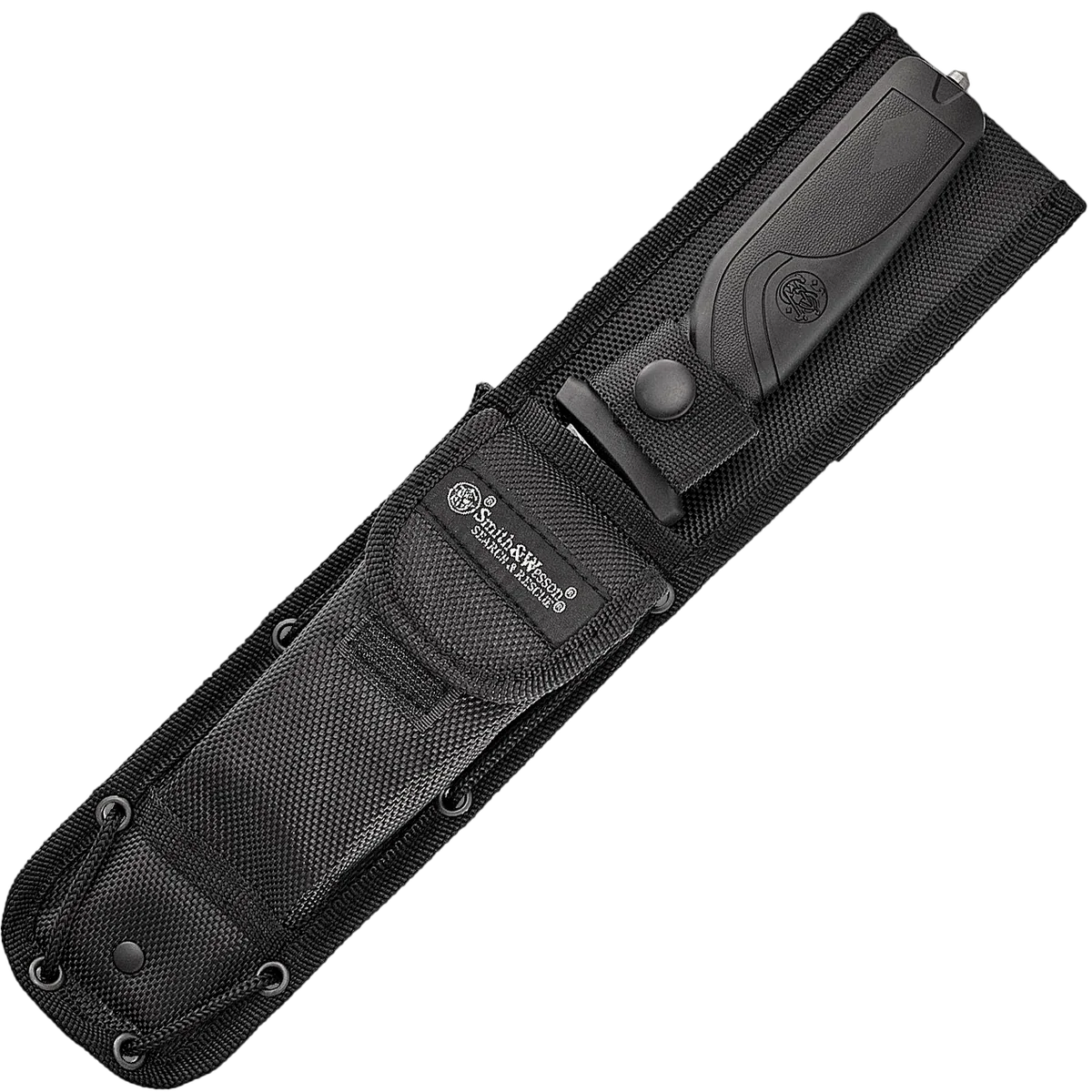 The Smith & Wesson Search & Rescue Fixed Blade has a 5.94" black oxide coated 8Cr13MoV stainless steel partially serrated drop point and it measures 11.02" overall. The handle is a durable textured rubber that provides a sturdy grip and the integrated glass breaker on the hilt provides additional functionality. The included nylon belt sheath allows the knife to strapped to a belt and the leg. Comes with a sharpening pad.