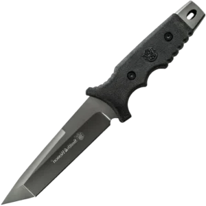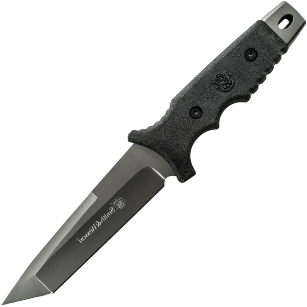 The Smith & Wesson SW7 fixed blade is a comfortable knife with an ergonomic zytel handle featuring finger grooves and blade guards for slip-resistance. The 9Cr17 steel tanto blade is titanium coated and sports a plain cutting edge. The included sheath is molded thermoplastic with a belt loop.