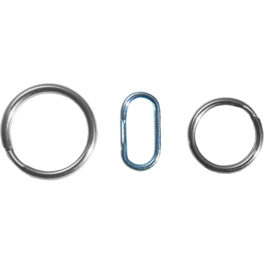 Never fall short when attaching your favorite keychain gear with this essential assortment of 24 split rings. Includes eight each of three different sizes, including the unique oval style. This set pairs well with our UFO titanium organizer. These are high quality USA manufactured split rings, don't settle for cheap alternatives! Split Ring Kit Features: Split rings made from stainless steel & zinc-plated magnesium alloy 24 split rings allow for full customization of keys Comes with unique oval style split ring What you get: Size 7 stainless steel split rings, fine: .430" [10.92mm] OD Size 9 stainless steel split rings, fine: .542" [13.77mm] OD Size 8 zinc-plated magnesium alloy, oval: .472" [12mm] x .236" [6mm] Packaged in a convenient snap-lid storage container