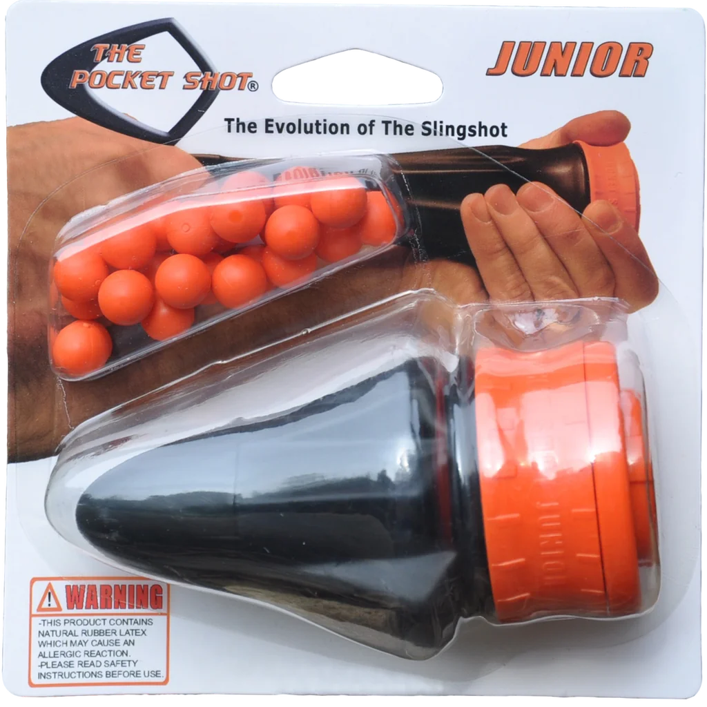 The Pocket Shot JUNIOR. All the fun of the standard PocketShot in a Tiny size. Ideal for back-garden target practice. The PocketShot Junior features an easy pull pouch. Includes approximately 25 rubber balls for safe target practice. The PocketShot should always be used in a safe environment, do not shoot at people or animals. Beware rubber ammo and regular ammo can ricochet off objects and are best used against a soft target. Do not overstretch the pouch or it may tear, always use genuine PocketShot ammo to ensure the pouches do not wear prematurely.
