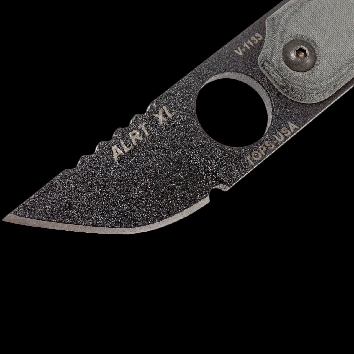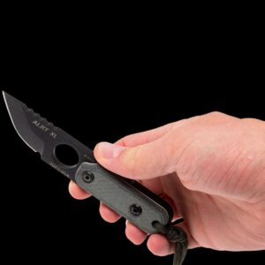 The TOPS ALRTXL 05 Neck Knife is a compact little powerhouse that features a 2.75 inch Hunters Point fixed blade made of 1095 steel with a non reflective Black Traction Coat. A large finger hole and notched thumb rest ensures secure grip and precise control. The ALRTXL 05 has full tang construction for strength; contoured black linen Micarta scales and a lanyard hole. An injection molded neck sheath is included. The TOPS Knives ALRTXL 05 Neck Knife has an overall length of 5.37 inches, and it weighs 3.5 ounces; 4.3 ounces with the sheath. Made in the USA