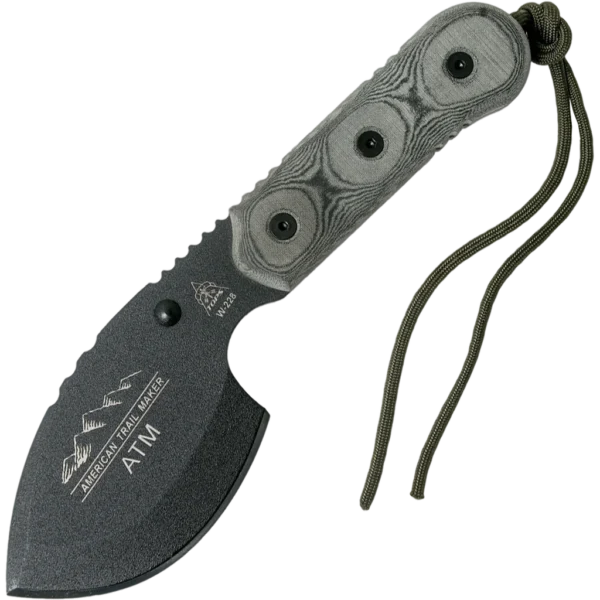 The TOPS Knives American Trailer Maker is a remarkable outdoor knife, designed by Jason Breedon. He meant this knife to be an all-round outdoor tool. To be used as a robust survival knife, but also as a small axe for heavy-duty chopping work. Everyone who regularly goes out into the wild understands the use of the ATM. At TOPS strength and solidity are key. As a result the TOPS Knives American Trail Maker is made from 1095 carbon steel. A robust type of steel that can handle its own. At the same time it is also easy to sharpen to make sure you can maintain it out in the field. The handle is made from micarta. A solid material made from linen and synthetic resin. If offers you enough grip even in wet circumstances. The TOPS ATM comes with a solid kydex sheath with rotatable steel belt clip. To make sure the heavy knife doesn't fall from the sheath TOPS has enhanced it with a solid retention system. Two protruding pins on both sides of the blade give the sheath the necessary grip.