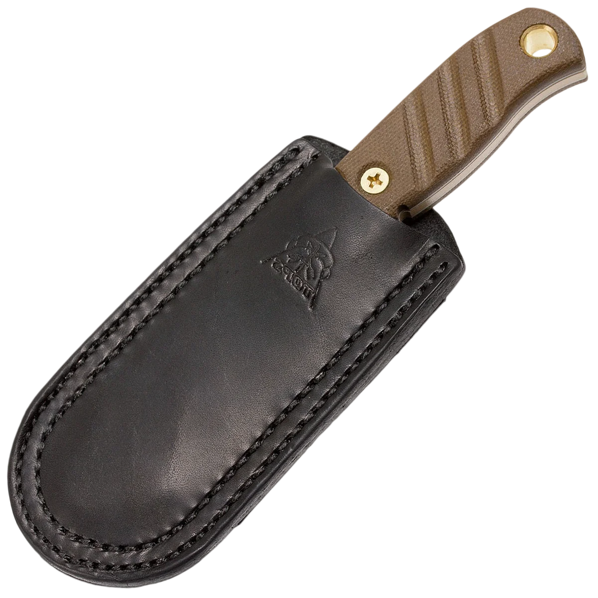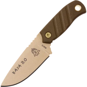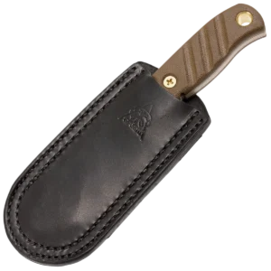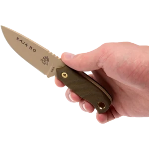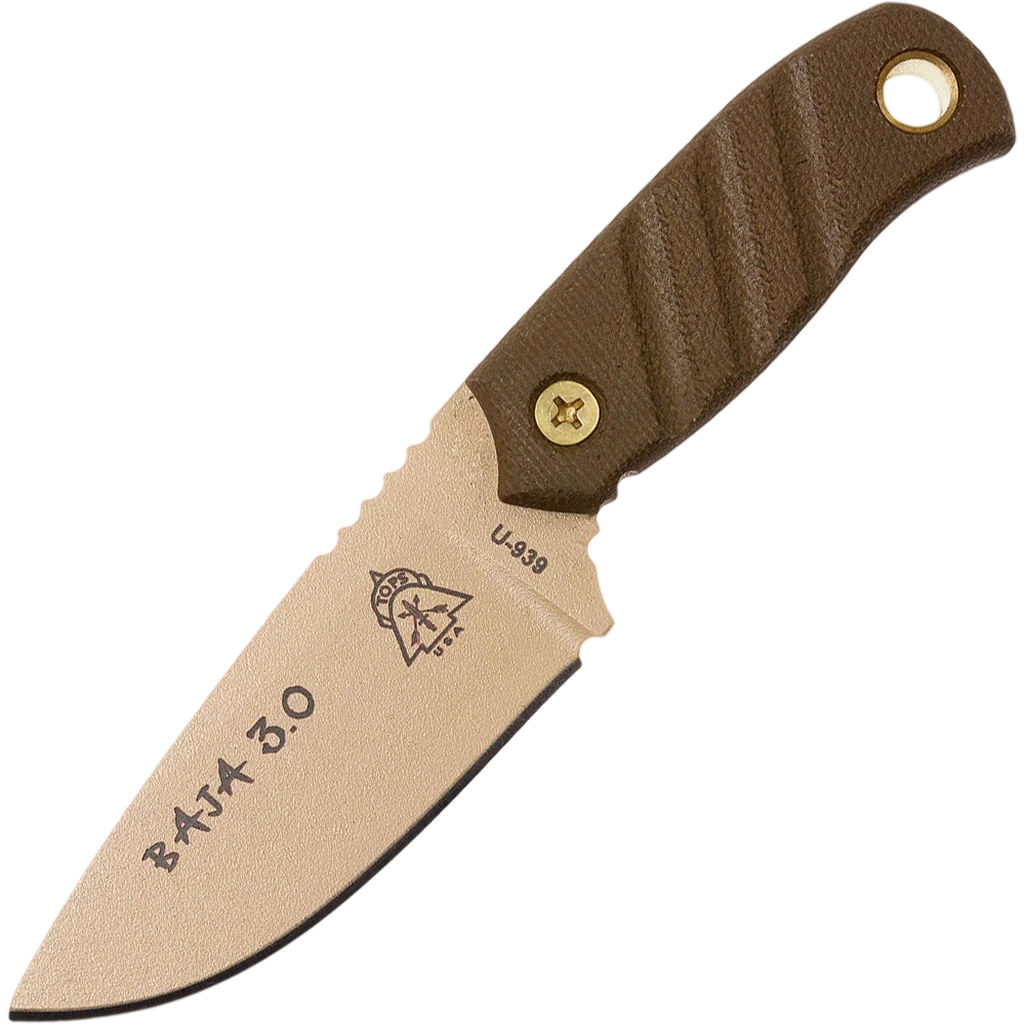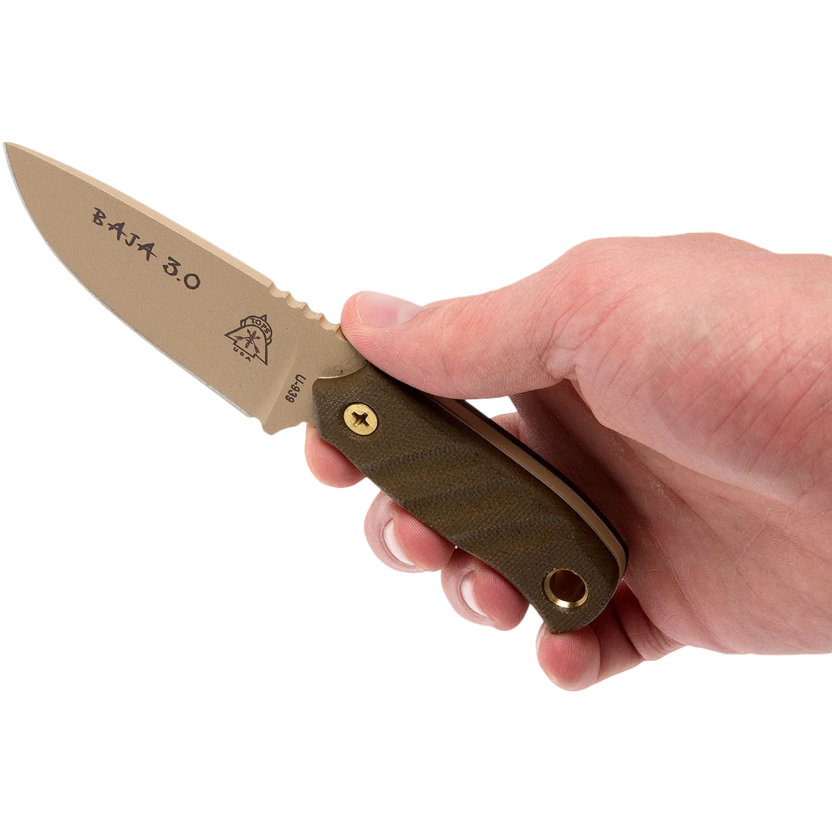 The Baja 3.0 knife is a compilation of simple design and fine execution. The 3.0 inch blade can adequately handle a wide variety of tasks, such as fashioning wooden implements, building fire and shelter, or food preperation around the campsite. The 1/8" thick, 1095 high carbon steel bites deep and can take a long slice. The simple handle design with its grooved green canvas Micarta scales, enable the user excellent traction in most circumstances.