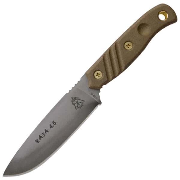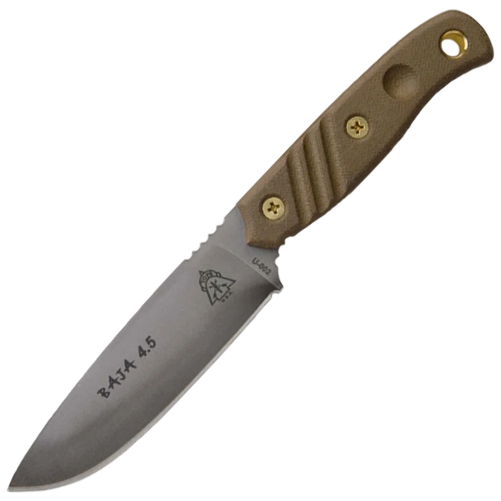 The Baja 3.0’s big brother has arrived. Based on customer feedback TOPS decided to stretch the popular 3 inch model. In place of the Coyote Tan powder coat, they've upgraded the finish with thier famous Black River Wash, which gives each knife its own unique look. Green Canvas Micarta handle scales and a high-quality leather dangler sheath make this a must-buy for users and collectors alike. Unlike TOPS’ other models in the 4 to 4.5 inch range, this one is 5/32” thick. That thickness along with a full flat grind gives it strength over 1/8” blades, but allows it to maintain superb cutting capabilities since it’s slightly thinner than 3/16”. They're professional heat treat gives a long lasting edge that is easy to re-sharpen once it is eventually needed. The jimping on the spine and along the finger guard is ideal for a solid grip in hard use or slippery conditions. Due to the thinner blade, it gives you better precision and greater range from making delicate cuts to cutting thick branches with ease. These same qualities make the BAJA 4.5 great for food prep as well. The inspiration for the name and design comes from Baja California. From the high point of Devil’s Peak at 10,157 feet, to the low Sonoran Desert, to the beautiful beaches, Baja is known for its contrasts. It is recognized worldwide for some of the most rugged, “bad ass” terrain.