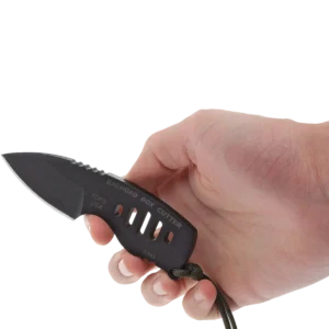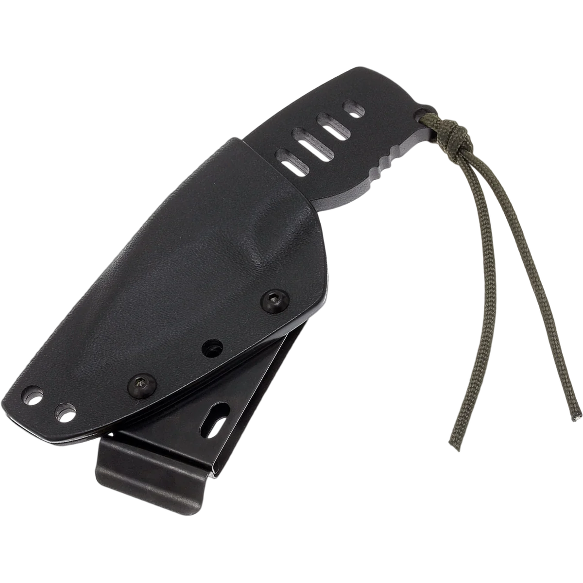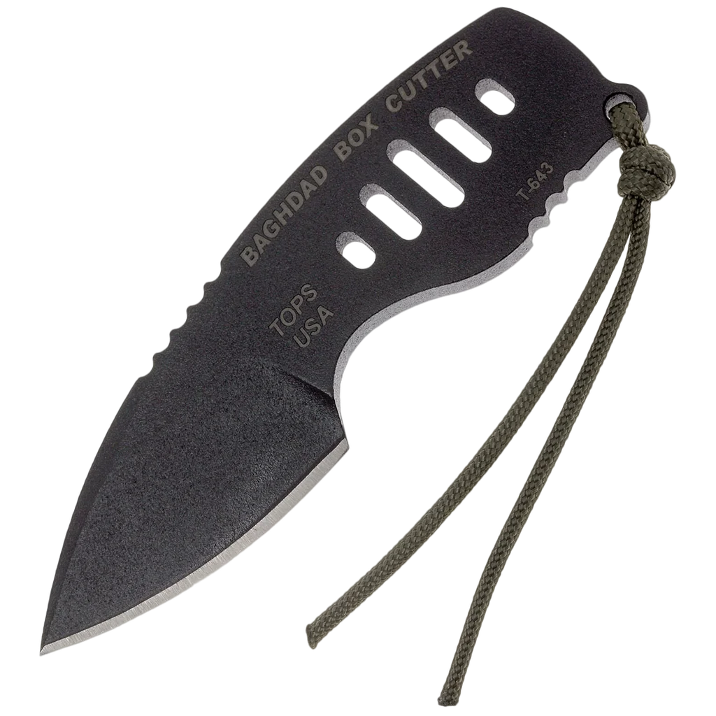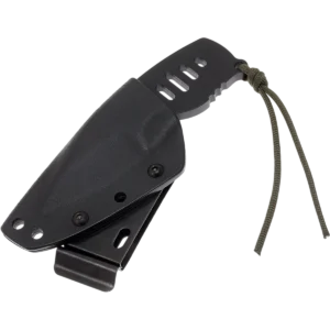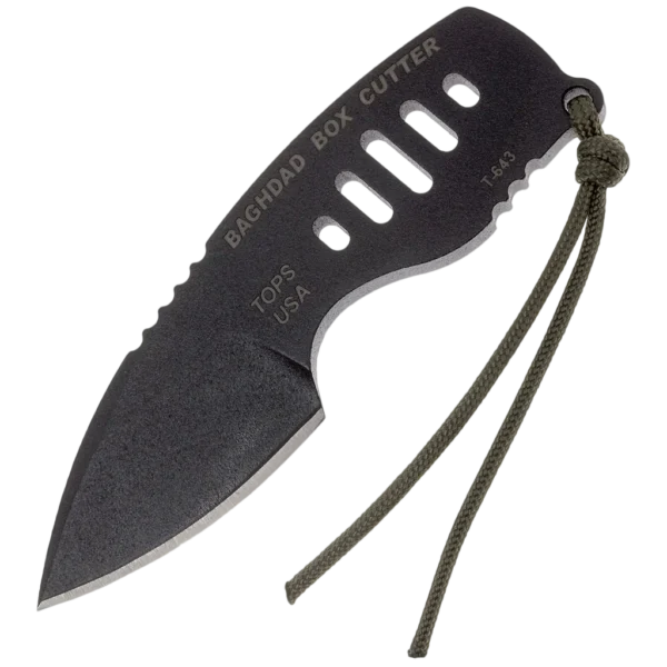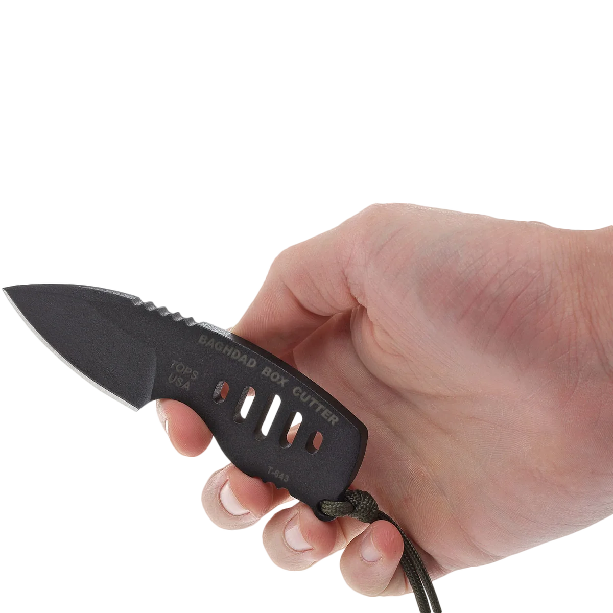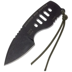 The TOPS Knives BBC-01 Box Cutter is a special fixed knife. In terms of size you would think this is a neck knife, but the weight of it comes closer to an EDC. With a blade width of 6.6 mm you can use it for heavy duty. TOPS originally designed this knife specifically for military personnel in Iraq and Afghanistan. They could hang it from their belt or backpack and use it for heavy tasks. The blade of 1095 carbon steel has black Traction Coating to protect against corrosion and reflections. The handle is partly skeletonized to save weight. The knife comes in a very tight kydex sheath and it also has a belt clip. This knife is hand-made by TOPS Knives in America. Each knife is carefully checked before it leaves the workshop. Every knife has a unique serial number. The sheath has a life-saving whistle with the logo and creed of TOPS Knives: Spec Ops, Trust TOPS!