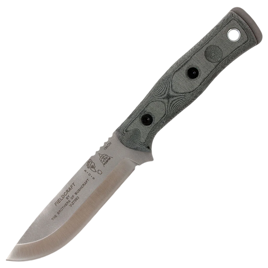 The popularity of TOPS Fieldcraft knife (aka BOB, aka Brothers of Bushcraft, aka BROS) has prompted multiple versions of the model. However, all of those versions were still made from 1095 high carbon steel, until now… TOPS is proud to present the Fieldcraft in 154cm stainless steel. 154cm is a high quality steel that makes excellent knives. This version of the knife is available in any one of the handles that we make. It is the same size as the other Fieldcraft models. The Rockwell hardness is 58-60, and because it's stainless, it is a full heat treat and not a differential heat treat. Some of the bushcrafters out there will like this feature because with a small, simple modification, they can use the spine for striking a ferro rod or for scraping tasks. The Fieldcraft Knife was designed by The Brothers of Bushcraft, a coalition of men across North America focused on sharing wilderness living skills of all categories. From tracking, to building shelters, the Brothers of Bushcraft make it a point to show the skills to all people, of all ages, from all over.
