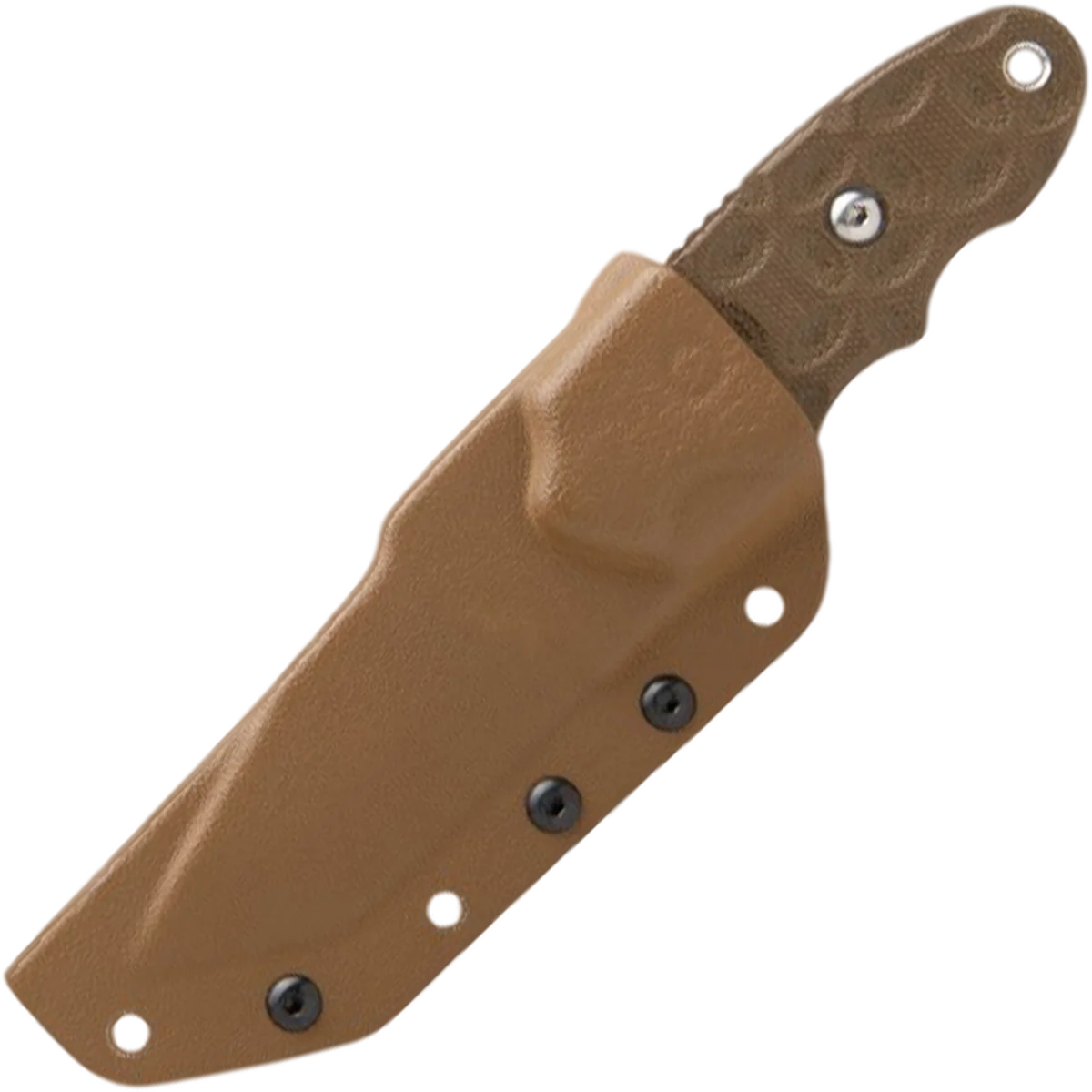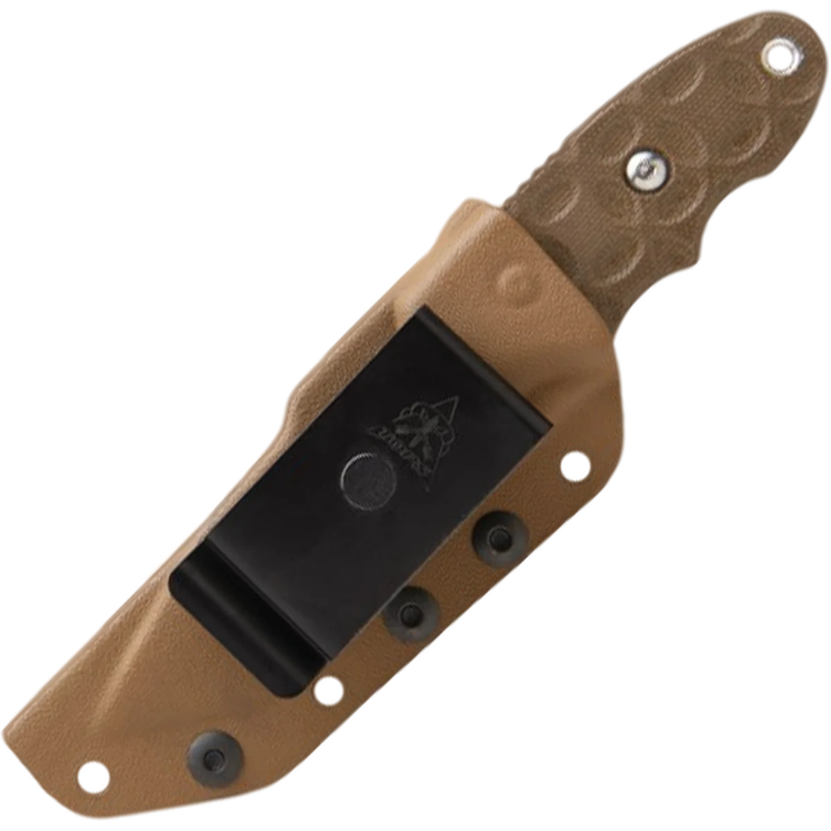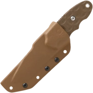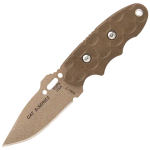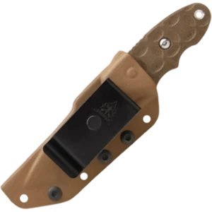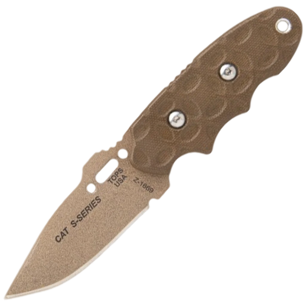 The C.A.T. series includes some of the earliest models TOPS ever produced, and they have been in service ever since. They have been carried by military, law enforcement, hunters, campers, and bushcrafters. The updated colors on the S-Series are perfect for outdoorsmen who are not looking for a tactical knife. At the same time, the new colors are great for military men and women serving in desert environments. The tan blade, handles, and Coyote Tan Kydex sheath will blend in with desert colored uniforms and equipment. Since it comes with our Rocky Mountain Bull’s-eye handle scales, it will look and perform superbly. The design allows for a multitude of EDC/wilderness uses. The Kydex sheath has a rotating clip so it can be worn in multiple carry positions. Please Note: TOPS are in the process of updating the finish color that they use for their tan blades so the colour you recieve may not match the one shown on the website.