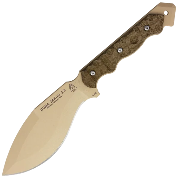 The Cuma Tak-Ri has a 3/16" thick full-tang 1095 steel Kukri blade with milled Micarta scales. The tan coated blade has a long sweeping edge with an unsharpened top edge. The handle is designed to give the user the ability to not only use this knife in full chopping/swinging mode, but also to choke up on the blade for more delicate tasks. The base of the handle can be used to pry and scrape, further extending the ground this knife can cover.