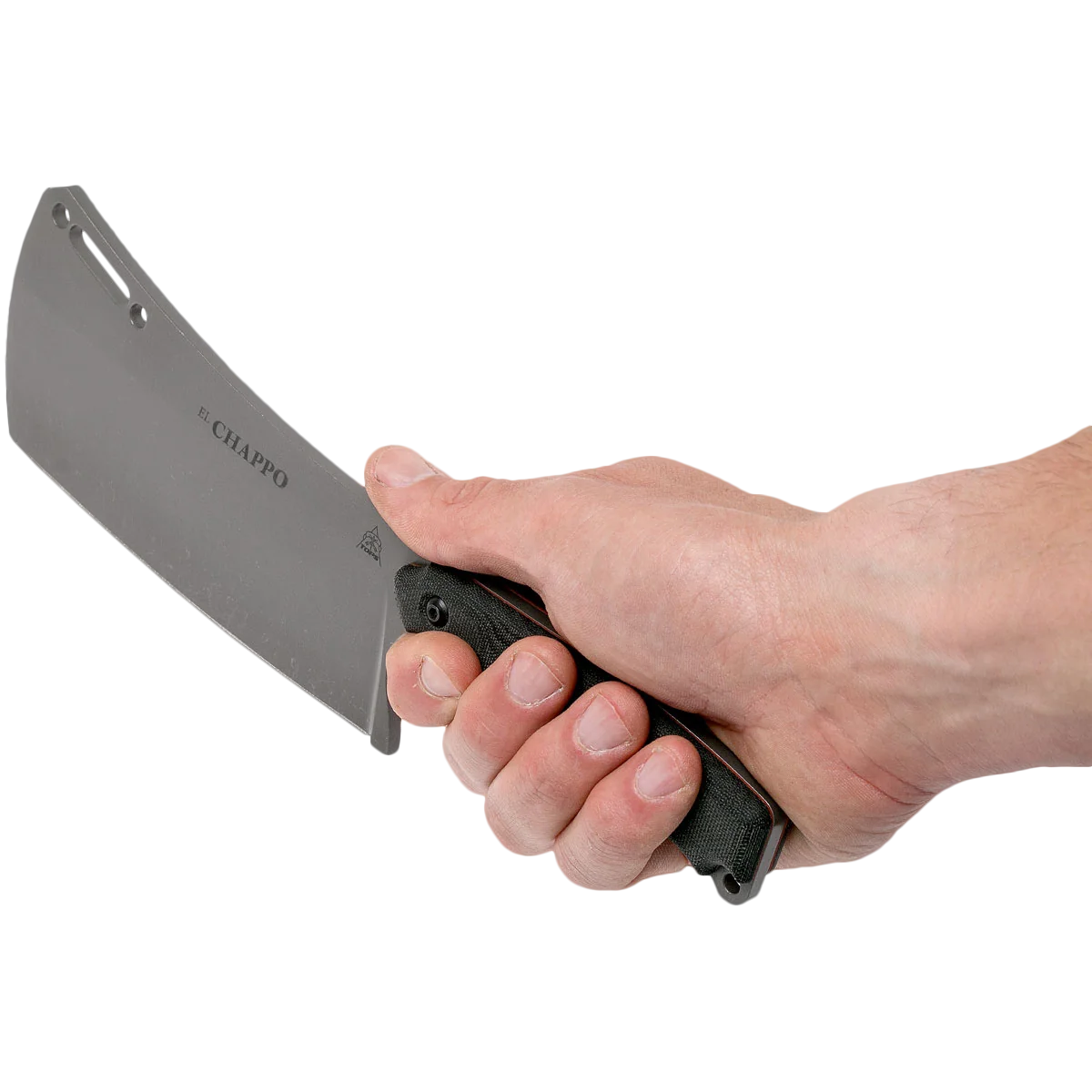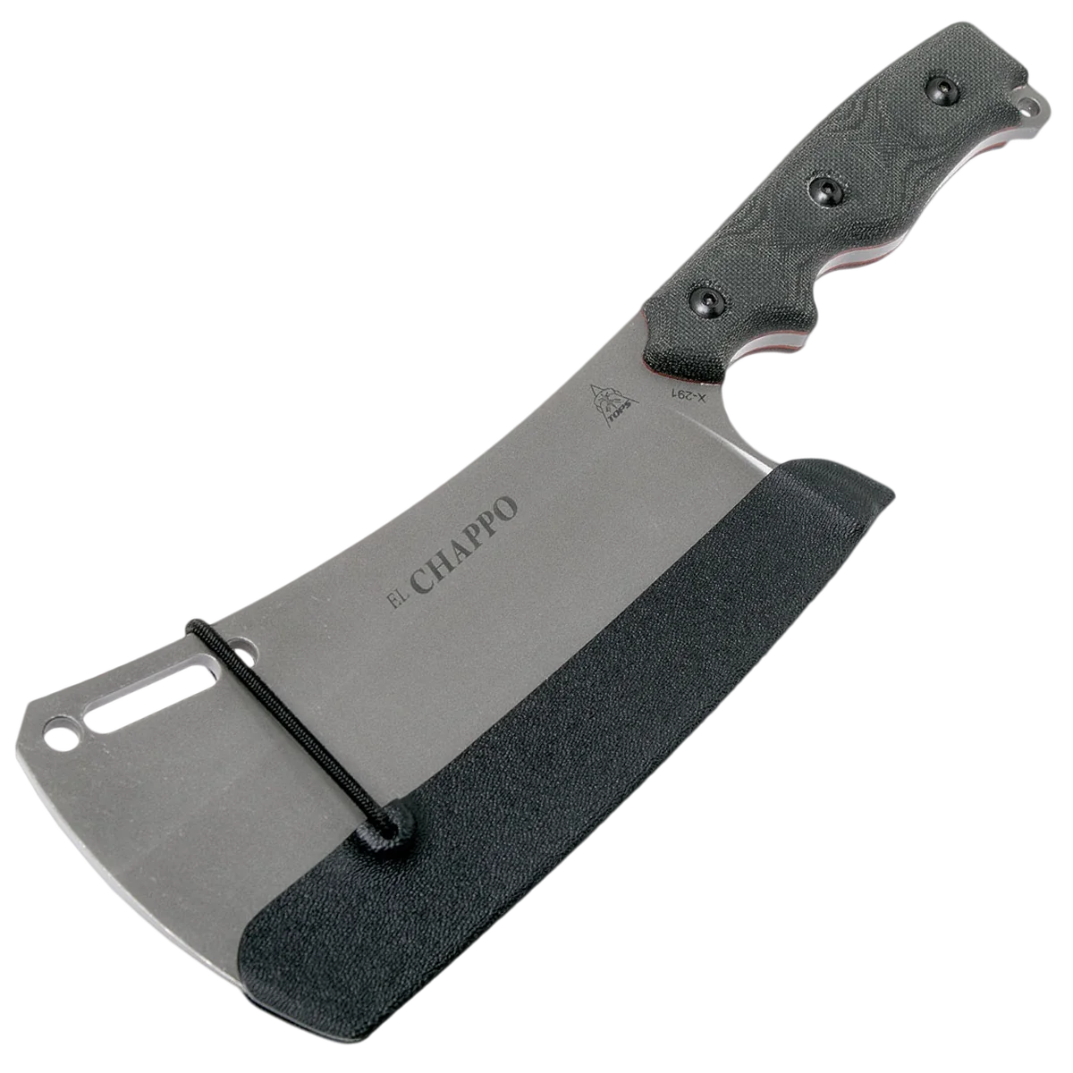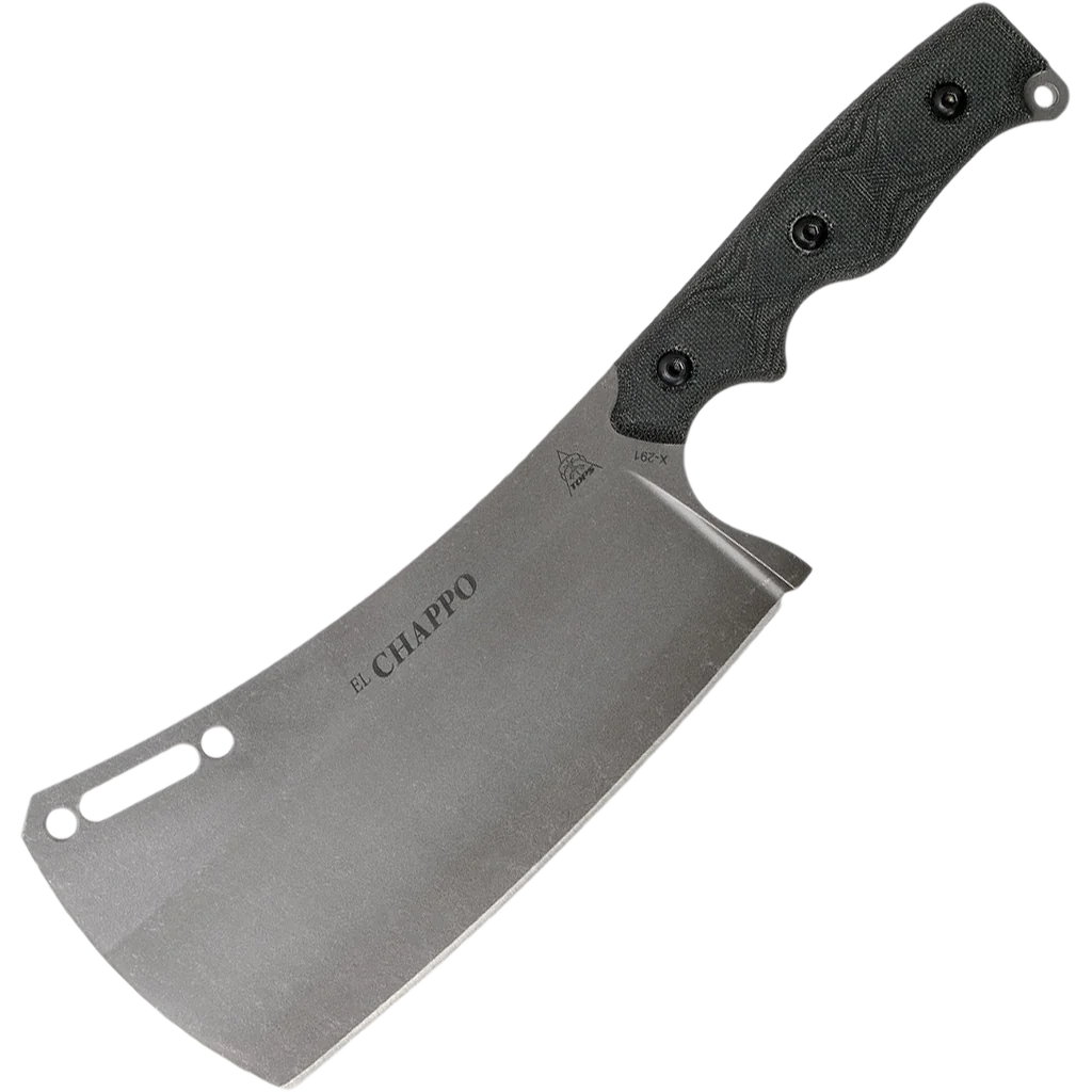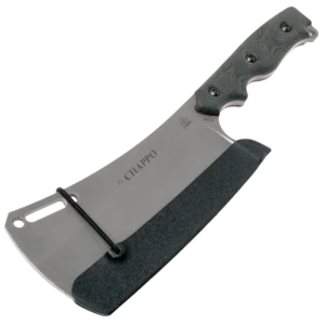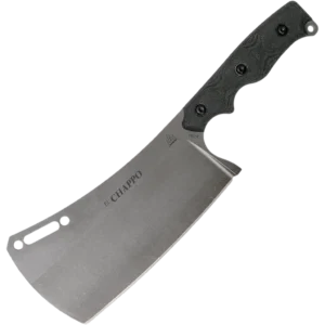 Leo Espinoza, TOPS’ President, has played with a few cleaver designs in the past and decided that with the success of the FMS knives and since TOPS is debuting a chef’s knife this year, it was time to make El Chappo happen. While this cleaver can be used for heavier veggie chopping tasks, it's primarily made to cut meat. With a blade length of 6” and a thickness of 3/16”, this cleaver has the weight and capability to help you take care of whatever meat processing you may encounter. It's made of 1095 high carbon steel and has TOPS' new Acid Rain finish. It comes with a Kydex Blade cover that is held in place with an elastic shock cord. El Chappo is a cleaver that is as useful in the kitchen as it is in the field.