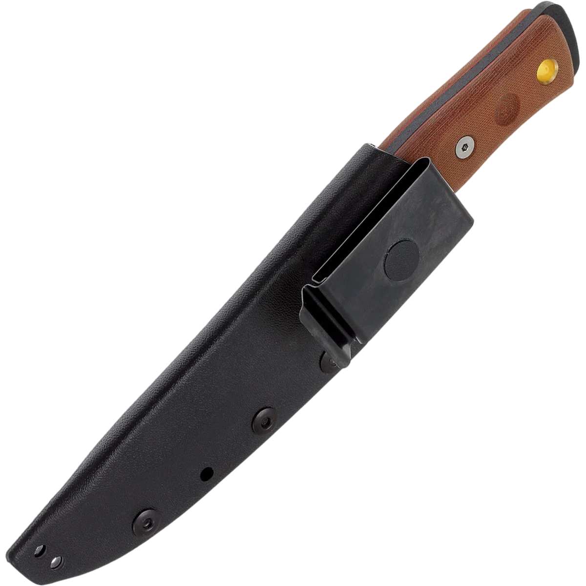 The Fieldcraft Knife was designed by The Brothers of Bushcraft, a coalition of men across North America focusing on sharing wilderness living skills of all categories. From tracking, to building shelters, the Brothers of Bushcraft make it a point to show the skills to all people, of all ages, from all over. The Fieldcraft Knife is the culmination of their knowledge, combining experiences from; the broad and humid rain forests, the arid and scorpion-littered deserts, and the frigid northern lands that span the Americas. The knife is 10 inches long in total, with a blade length of 4 1/2 inches. This makes a compact, but extremely serviceable knife. The Fieldcraft's blade is 3/16" thick, and made of 1095 High Carbon steel. The handle is one of the most ergonomic ones on the market, sporting several useful additions. Although knives with a lot of frills often end up lacking, the additional items found on the Fieldcraft knife were selected from experience and critiqued in every step of design, development and production. Being made of canvas Micarta, the handle will never let you down. The bow drill divot on the handle is frictionless and makes starting those primitive fires almost effortless. The "Thumb Scallops", formed on the hilt of the handle offer more comfort and control when using specialized carving and skinning grips. The pommel of the blade is simply the tang of the knife exposed enough to allow impact from a baton to not effect the handle (though the Micarta is definitely tough enough to take such abuse). On the exposed pommel, you will find a scraper specially designed by one of The Brothers of Bushcraft, for striking Ferro rods in a safe and efficient manner. The sheath is a strong, durable Kydex, with a steel belt clip. This arrangement allows a safe, secure and comfortable carry on the belt, pack strap, or even around the neck. With a built in Ferro-rod attachment point, the sheath now doubles as a minimalist survival kit.