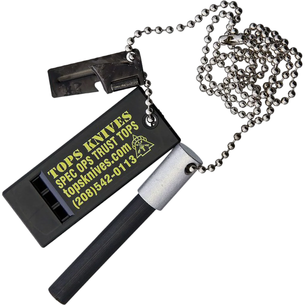 This emergency fire starter kit is lightweight, easy to carry, and will work even if previously soaked in water. The Ferrocium rod is very dependable. This kit includes the fire starter, a TOPS Survival Whistle, A P38 can opener (which can also be used as a striker for the Ferro rod), and a 30 inch ball chain.