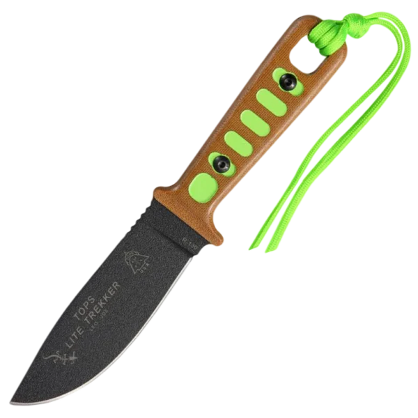 TOPS Lite Trekker (Traveling light… and doing it right) In recent years, there has been a surge in outdoor activities; trekkers, backpackers, survivalists, preppers, and numerous other like-minded individuals are spending more and more time developing their skills and using their tools to improve their level of self-reliance. Regardless of whether you are going "off grid" for the weekend or adding this knife to your Bug-Out-Bag. The TOPS Lite Trekker fulfills two tasks especially well #1- It's efficiency and #2- It's light and as strong as possible. After numerous revisions, the TOPS Lite Trekker has several well-thought-out features such as a positive grip, high-visibility squares set into the handle design, and a wide yet thin blade that keeps weight down and strength up. When selecting one of the neon versions, the textured handle includes a neon cord matching the choice of colored squares. It is flat ground for the sharpest and lightest combination in its size class. This tool comes with a 3 rod fire-starter and 126 DB emergency whistle. Wherever your travels take you or what surprises come your way, you can feel comfortable with the capabilities of the TOPS Lite Trekker.