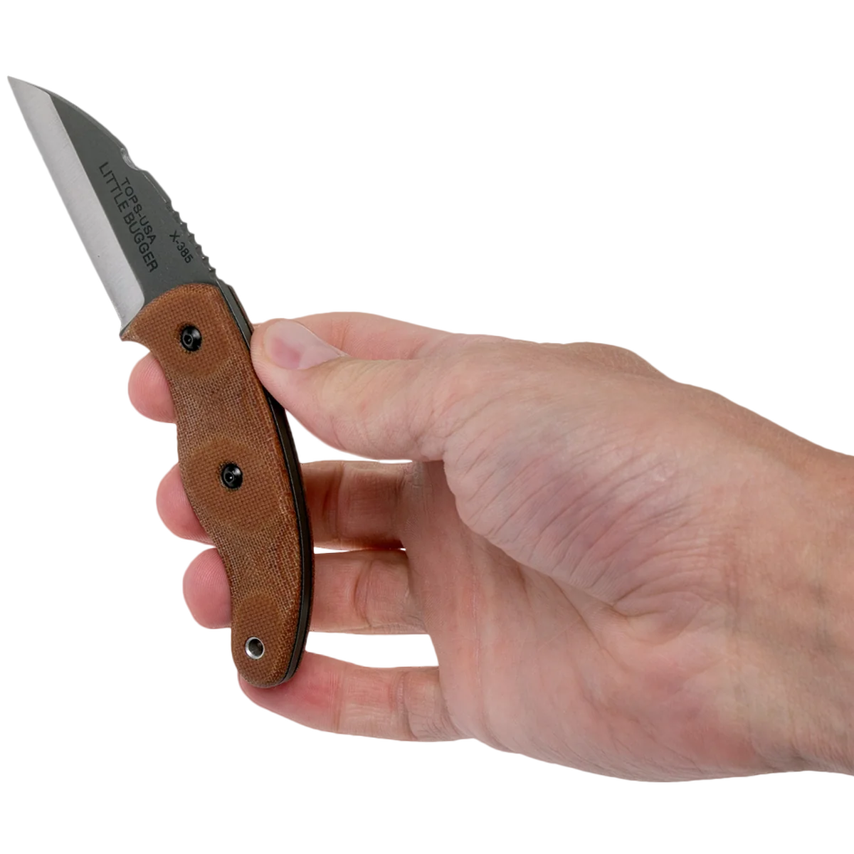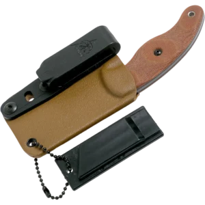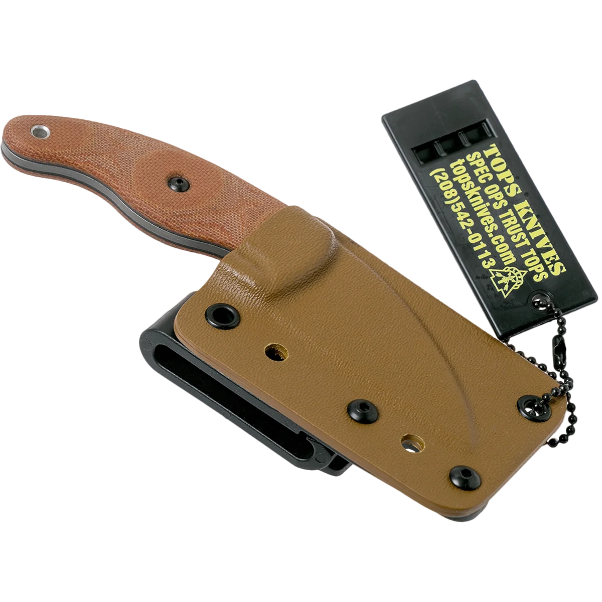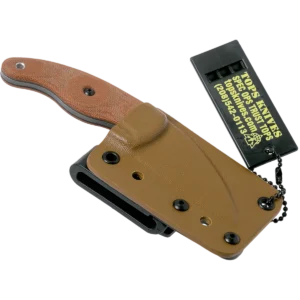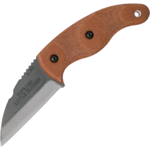 The LILB-01 TOPS Little Bugger is a compact, slim profile utility knife, designed by survivalist Matt Graham, that features a 2.38 inch Wharncliffe fixed blade made of 1095 steel, .090 inch thick, with a Rockwell hardness of 56-58, a tumble finish, modified Scandi grind, and a notched thumb rest for secure grip. The Little Bugger Knife has full tang construction for strength; ergonomic tan canvas Micarta scales with finger grooves and a palm swell for secure purchase, contrasting black liners and a lined lanyard hole. A Coyote Tan Kydex sheath with black injection molded J-Clip is included. The TOPS Knives Little Bugger Knife has an overall length of 5.75 inches, and it weighs 2.4 ounces; 3.7 ounces with the sheath. Made in the USA.