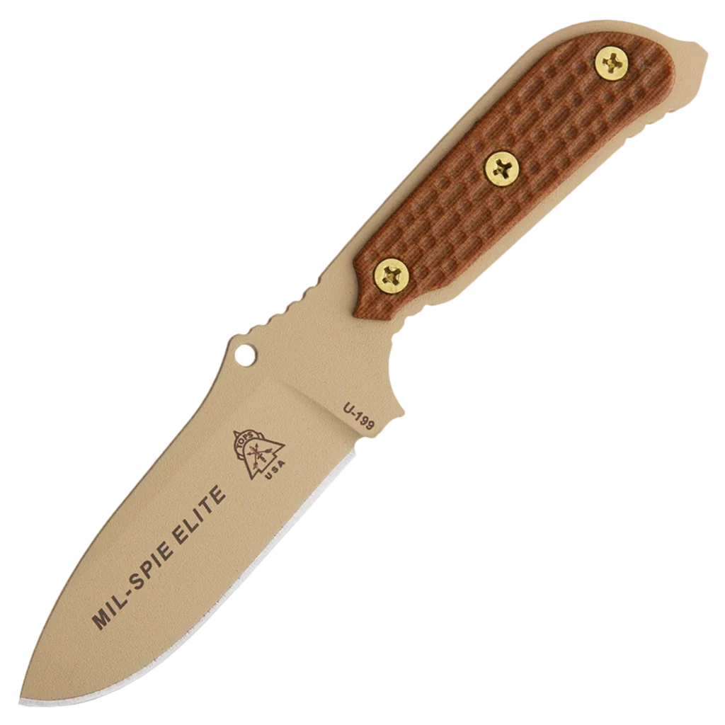 TOPS Knives is often approached by individual Operators who advise us of the criteria that need to be met for their unit’s upcoming missions. We were challenged with developing a small and a large field knife with a narrow carrying profile that had to be strong, yet lightweight. With these criteria in mind, we created the Mil-SPIE Knives. This version is called the Mil-SPIE Elite. It is the same size and specs as the Mil-SPIE 3, with a few differences. The Elite version is 1095 high carbon steel instead of 154cm, which makes field sharpening much easier. You can choose between Black Linen Micarta or Tan Canvas Micarta handle scales, and it comes with a Kydex sheath with a rotating belt clip. A classic blade design with a comfortable, thin handle makes this knife easy to use whatever your situation. Choose between Black Linen Micarta and Tan Canvas Micarta handle scales.