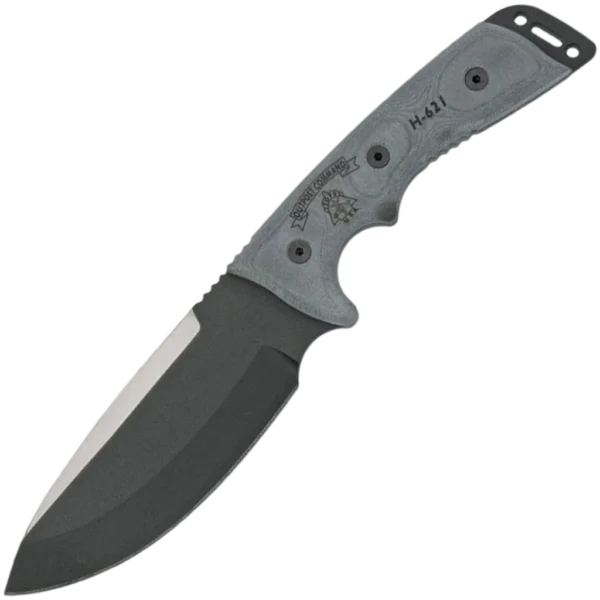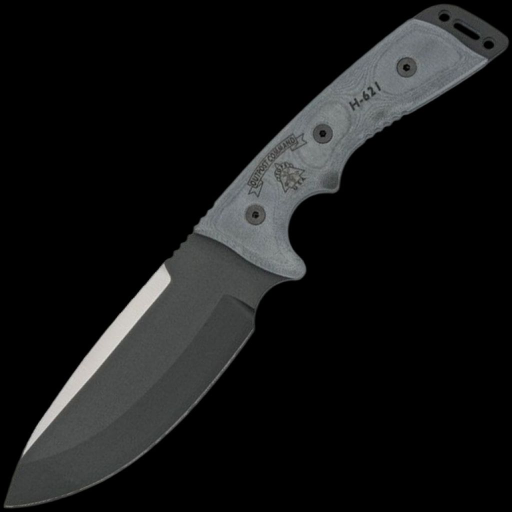 The Outpost Command is a serious outdoors knife. It is made from a 1/4" thick piece of 1095 steel that extends from the butt of the knife to the tip of it's big belly blade. This knife is a great choice for use a survival knife with a size that can cut down small trees for shelter and a well-designed handle with finger placement for big and small tasks. This another great knife from TOPS Knives that will serve you well.