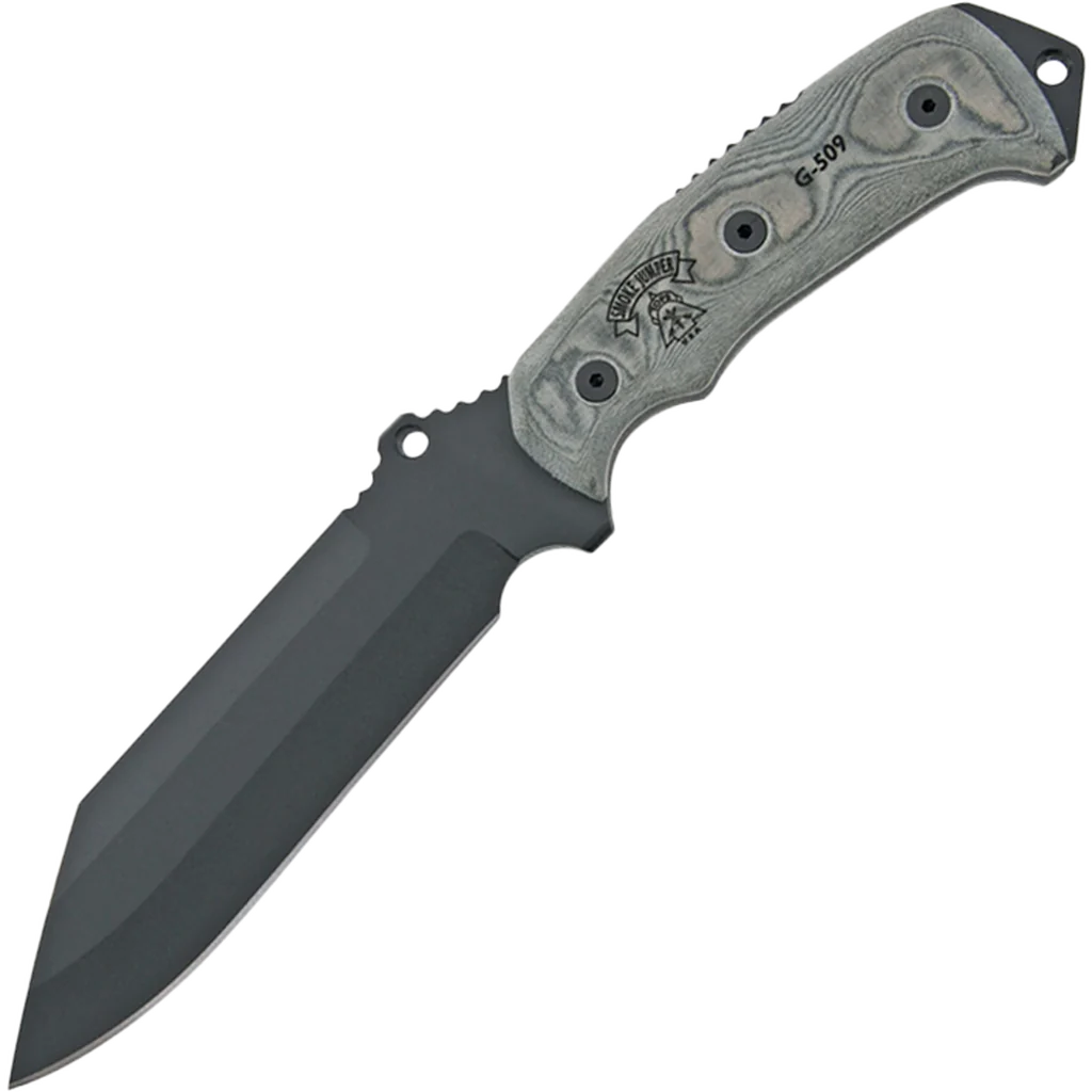The Smoke Jumper fixed blade was designed with the user in mind. By definition a Smoke Jumper is a wild land fireman who parachutes into a remote area to put out wildfires. The 1/4" thick 1095 high carbon steel blade is perfect for splitting, batoning and prying if the job calls for it. The handle is black linen Micarta with extended pommel for lanyard attachment. The Smoke Jumper includes a Kydex sheath with rotating steel spring clip.