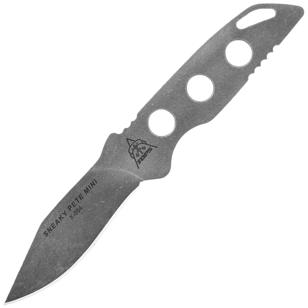 - The Mini Sneaky Pete has a black coated 1095 Carbon Steel blade and skeletonized handle