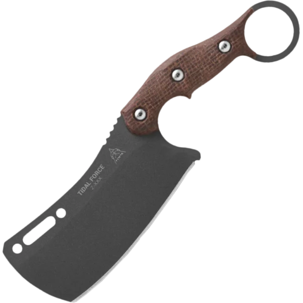 Let’s face it. Cleavers are awesome. So are Karambits. Put them together the right way, and you end up with an interesting tool. The Tidal Force is that tool. Use it for daily tasks. Use it for food prep. Use it outdoors. Whatever you decide to use it for, you’ll look good doing it. It has TOPS famous differential heat treated 1095, Some classy burlap Micarta handles and a solid Kydex sheath with a leather dangler. Made in USA.