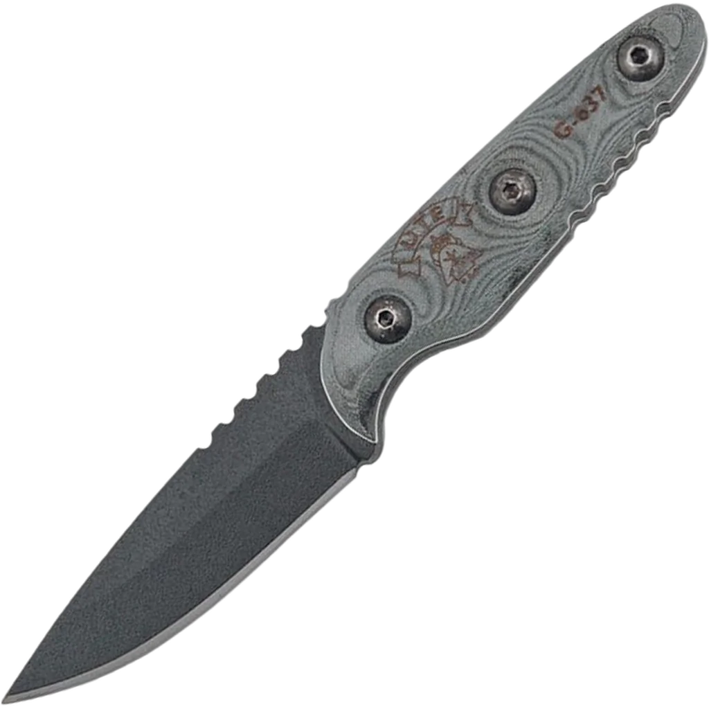 The TOPS UTE #02, standing for Utility Tool Edged, was designed to be simply functional. Clean and uncomplicated lines combine with thick tool steel construction to offer a versatile all around knife that can not only tackle the average day to day, but also the extreme. The TOPS Knives UTE #02 features a black traction coated 1095 carbon steel blade and a black linen micarta handle. The base of the blade spine has jimping on it, as does the base of the handle, and the handle also has a finger grove for a comfortable grip. The knife comes with a black kydex sheath with a spring steel belt clip