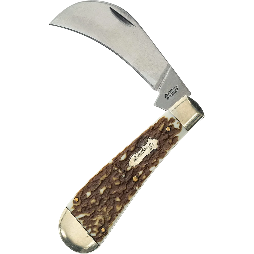The Schrade 16UH Uncle Henry Hawkbill Pruner features a 3" 7Cr17MoV blade made from high carbon stainless steel. The handles are Next Gen Staglon that looks very similar to actual stag with nickel silver bolsters and pins, and the Uncle Henry shield. The blade is simply opened with a nail nick. The Next Gen line of Uncle Henry knives really brings classic designs into the modern era with its updated materials.