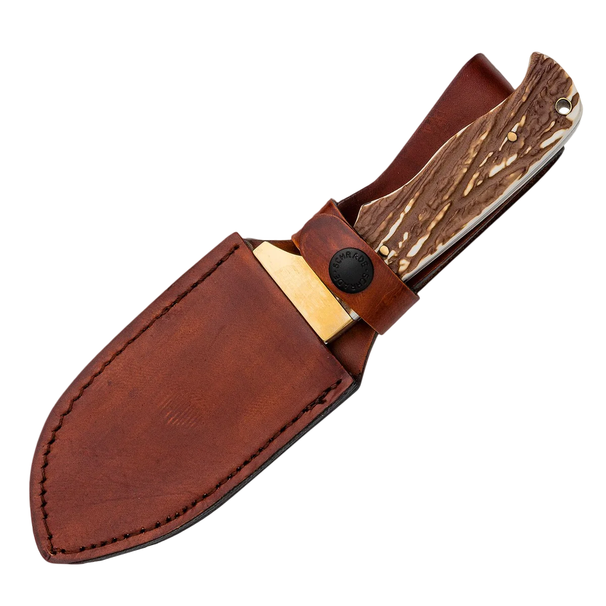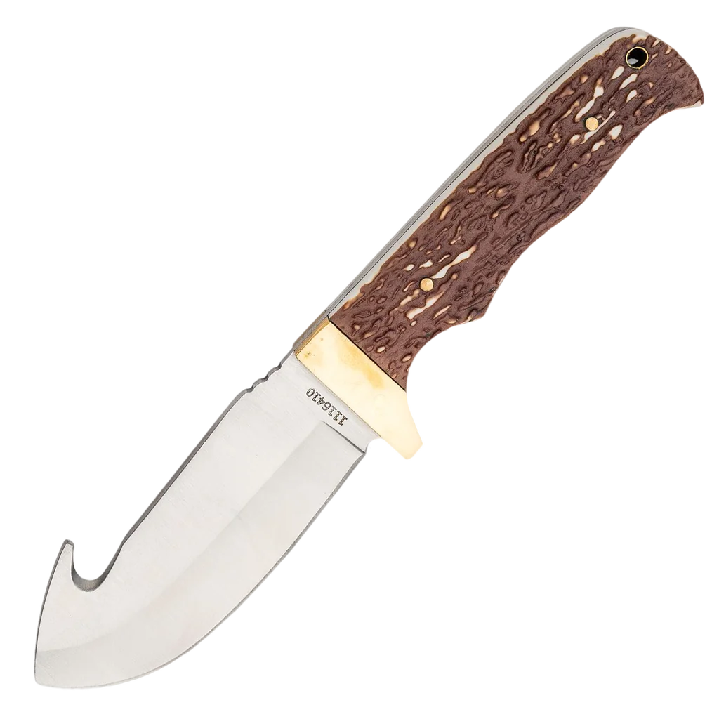 This next-gen line of Uncle Henry knives maintains the functionality of the originals with upgraded handle material for 2020. This 185UH fixed blade knife has a 4.3" high carbon stainless steel blade with a guthook and the realistic Staglon handles that have the look of real stag, without the cost. It comes with a premium brown leather sheath.