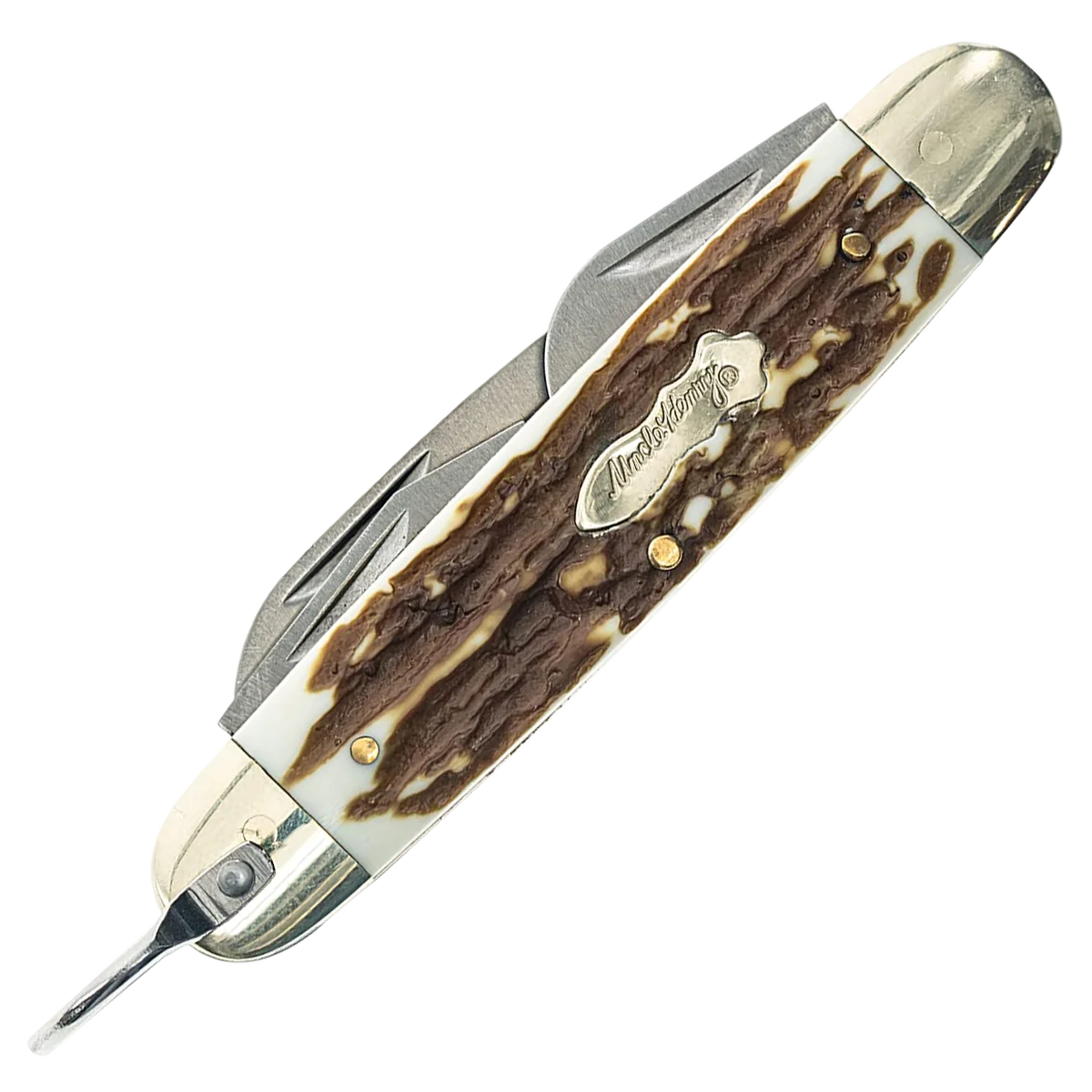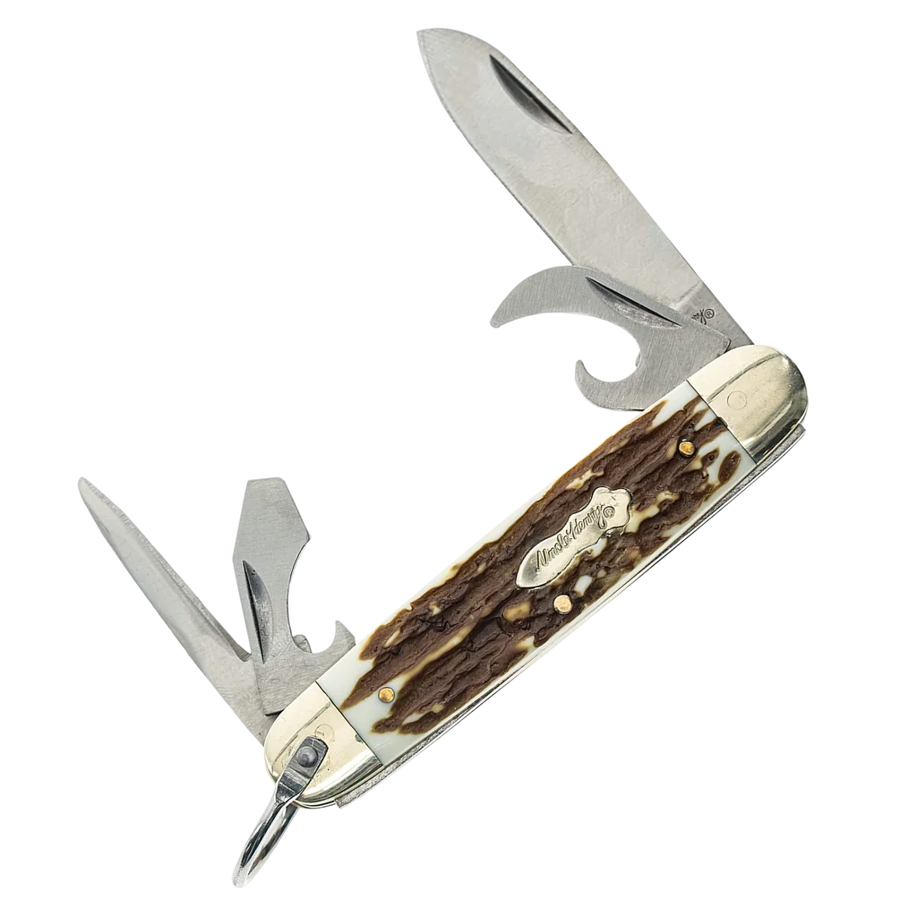 The Uncle Henry Scout Next Gen 23UH is an affordable classic pocket knife. It is enhanced with four tools: a drop point knife, can opener, bottle opener and an awl. Originally designed for outdoor use, it also serves well as a compact everyday pocket knife. It is opened with two hands and uses a slipjoint mechanism that provides resistance against accidental closing; it is not a locking blade. Uncle Henry pocket knives are crafted using solid brass liners and fittings, rugged Next Gen Staglon handles, and 7Cr17MoV high carbon stainless steel blades. This means you get a durable knife that does not require frequent oiling to prevent rust. 7Cr17 is a reasonably hard steel that will hold an edge well and possesses strong corrosion-resistant properties. The Next Gen Staglon handles have been redesigned to look as realistic and close to genuine stag as possible in a synthetic material.