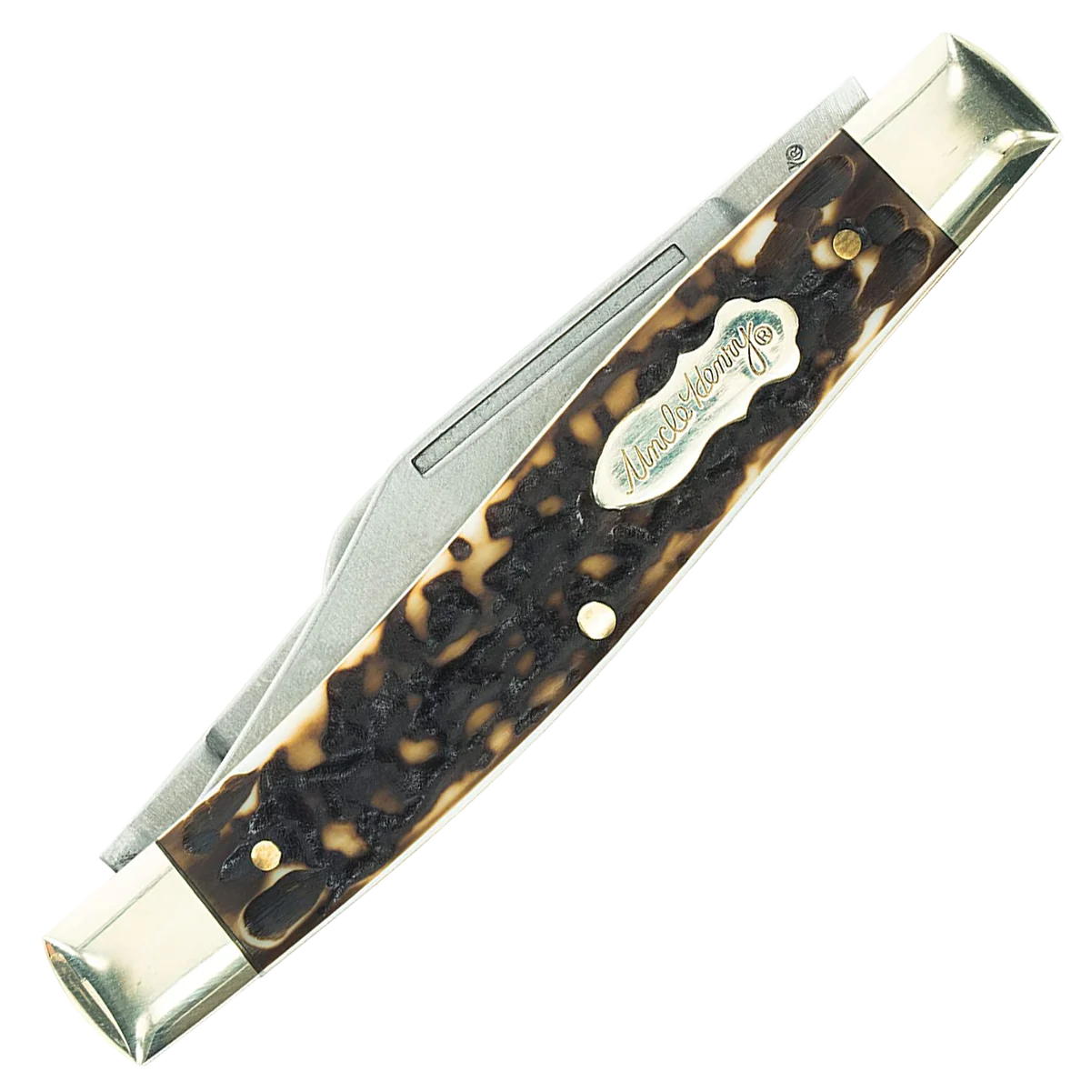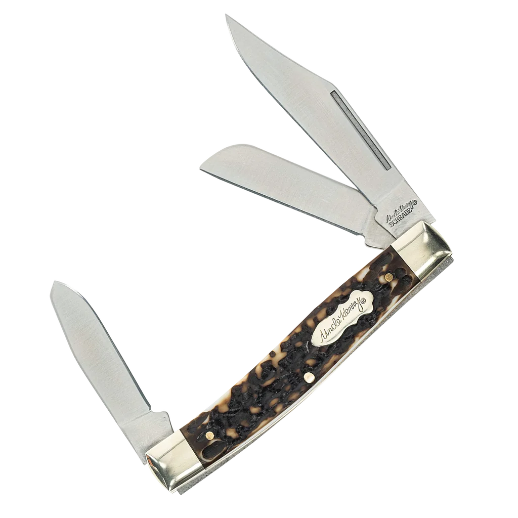Uncle Henry Next Gen pocket knives are crafted using solid brass liners and fittings, rugged Next Gen realistic Staglon handles, and 7Cr17MoV high carbon stainless steel blades. This means you get a durable knife that you aren't constantly applying oil to prevent from rusting. 7Cr17MoV is a reasonably hard steel that will hold an edge well and possesses great corrosion-resistant properties. The Sr. Rancher is a traditional folding knife that features 3 different blades to help you get the job done and is larger than the standard Rancher.