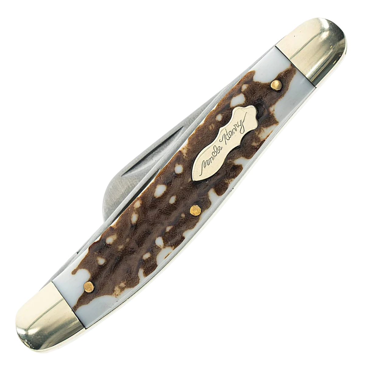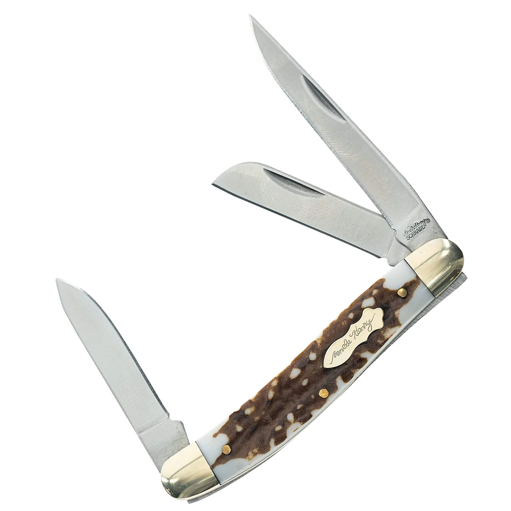 Uncle Henry Next Gen pocket knives are crafted using solid brass liners and fittings, rugged Next Gen realistic Staglon handles, and 7Cr17MoV high carbon stainless steel blades. This means you get a durable knife that you aren't constantly applying oil to prevent from rusting. 7Cr17MoV is a reasonably hard steel that will hold an edge well and possesses great corrosion-resistant properties. The 897UH Premium Stock is a traditional stockman folding knife that features 3 different blades and is perfect for day-to-day chores.