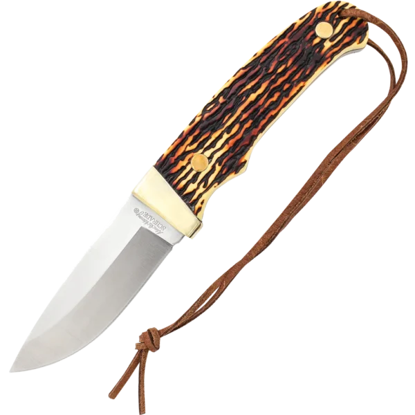 Uncle Henry Pro Hunter Full Tang fixed-blade knife with a 7Cr17 high carbon stainless steel drop point blade, Staglon handle slabs with nickel silver guard, lanyard hole and brown leather lanyard.