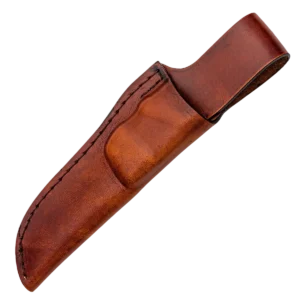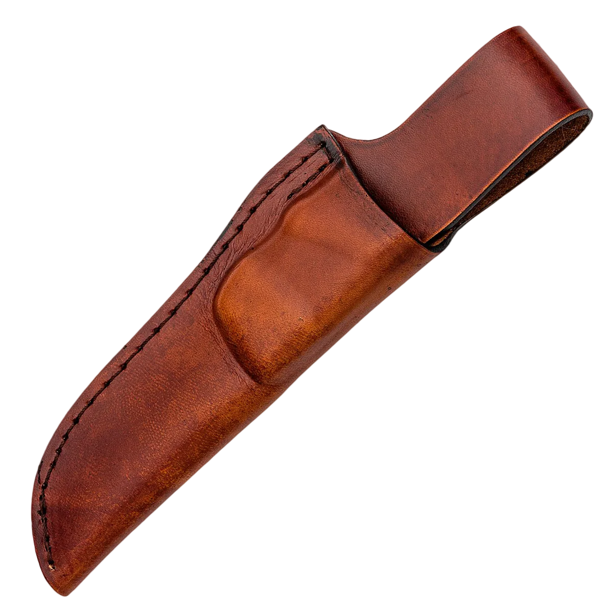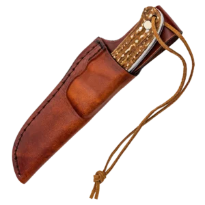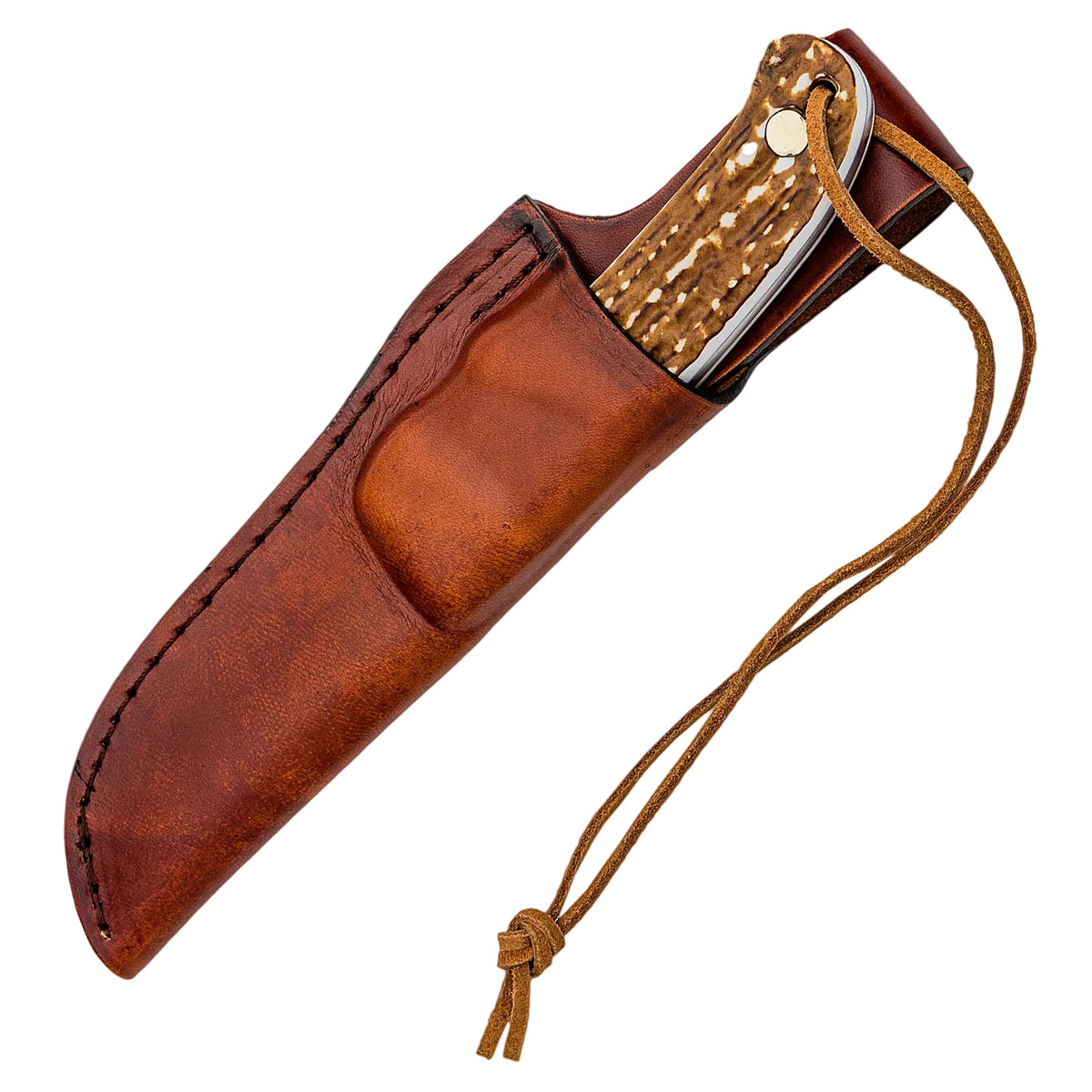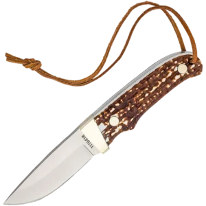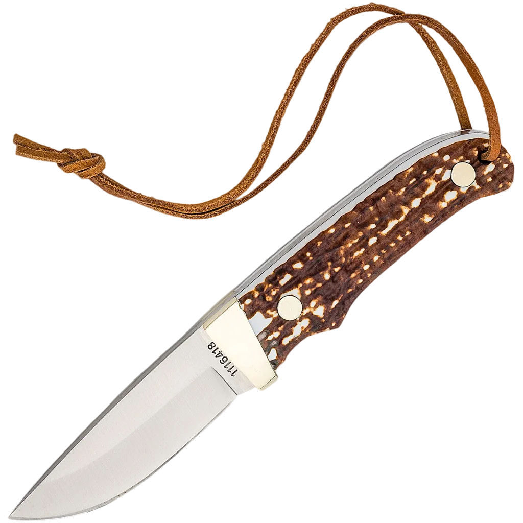 The Uncle Henry Next Gen PH1N Staglon Fixed Blade features a 3.5" 7Cr17MoV high carbon stainless steel drop point blade with a satin finish and staglon handles. The full tang fixed blade is 1/8" thick and features brass pins and a guard, and a leather lanyard. It's 8.125" overall and weighs 6.7oz. It includes a brown leather sheath with a belt loop.
