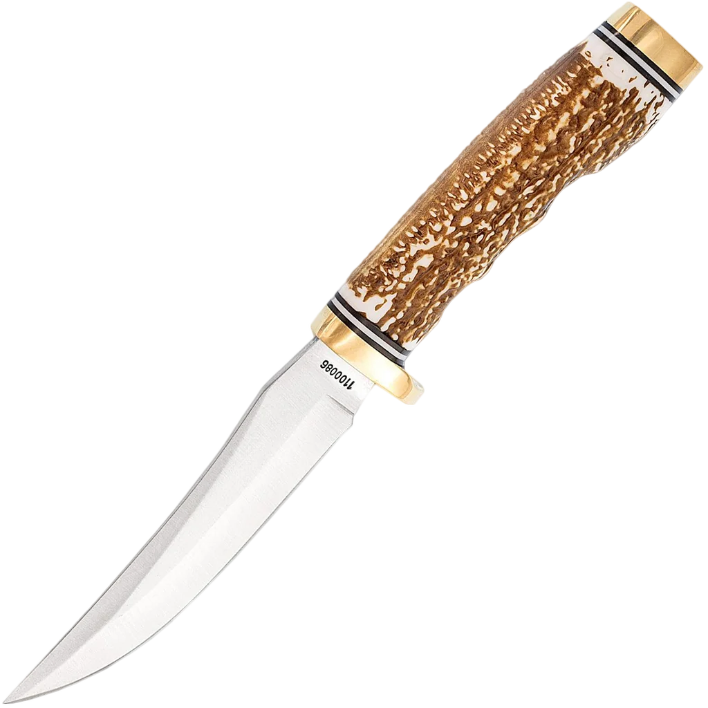 The Uncle Henry Next Gen 153UH is an affordable hunting knife. It has a pointed blade, and a large brass knife guard that keeps your fingers away from the edge. The handle is relatively thick, so you can get a good grip, even with large hands. The blade is made from stainless 7Cr17MoV steel, which is very tough and easy to sharpen. This makes it a great hunting knife. The handle is made of 'Staglon'. This is a plastic imitation of horn. It is strong and stable, and much more affordable than real stag horn. The knife comes with a leather sheath. The belt loop can be attached to belts up to 8.0 cm wide. There is a compartment at the front containing a sharpening stone.