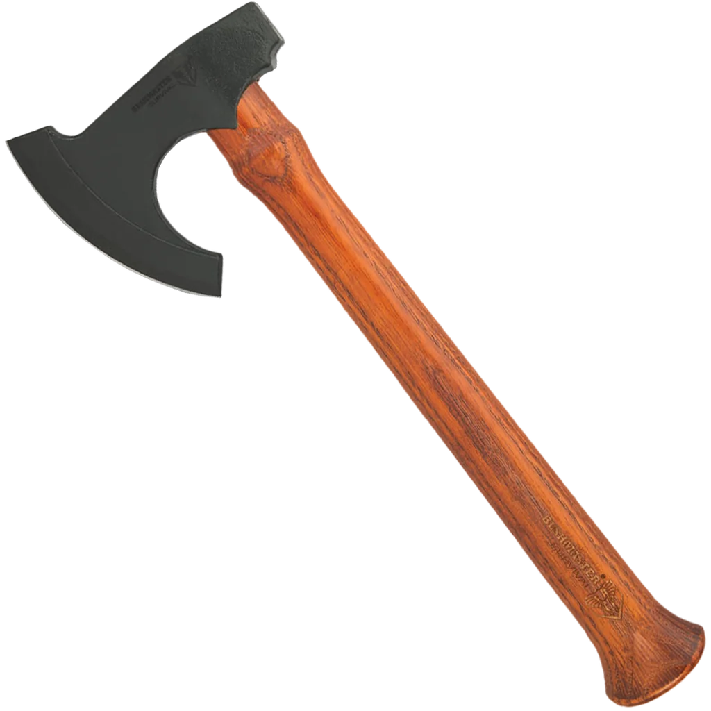 The Bushmaster Survival Axe makes a great addition to your camping and survival gear as it's a nice, compact size that will fit easily in your pack. The 5 3/10" axe head is crafted of 1055 high carbon steel with a dark grey coating and it has a sharp 4 3/4" blade edge. The axe can be wielded by its hardwood handle, which has a brown stained finish and a smooth, comfortable feel. The survival axe is 16" in overall length and the axe head can be protected by its genuine leather sheath with snap closure.