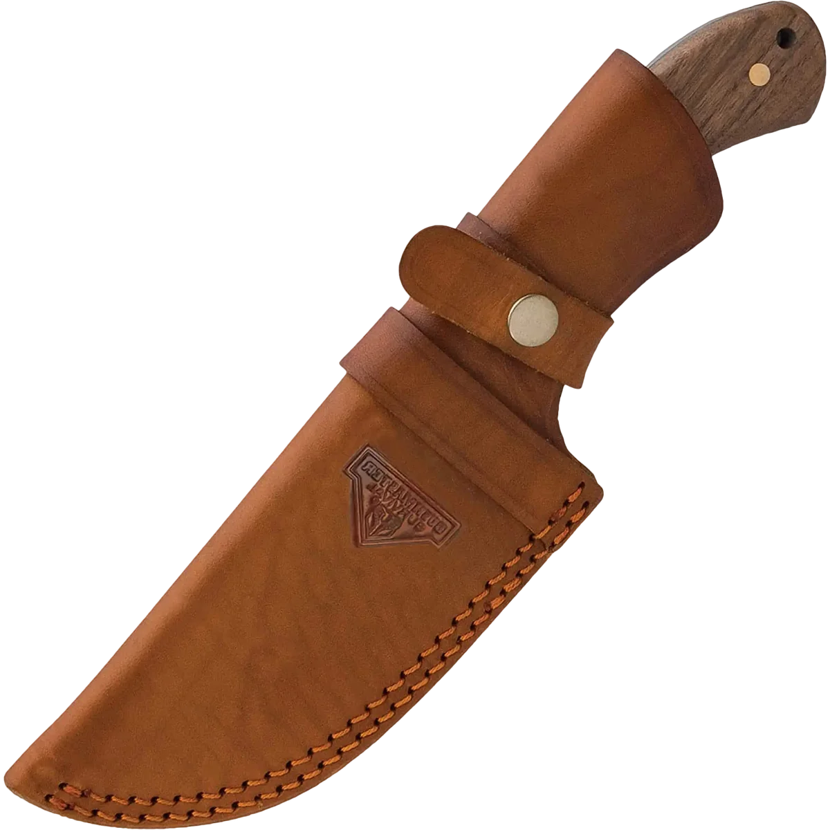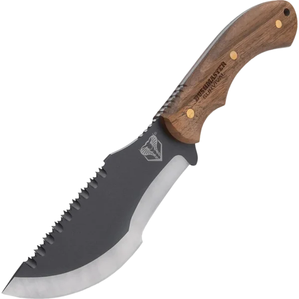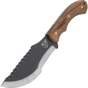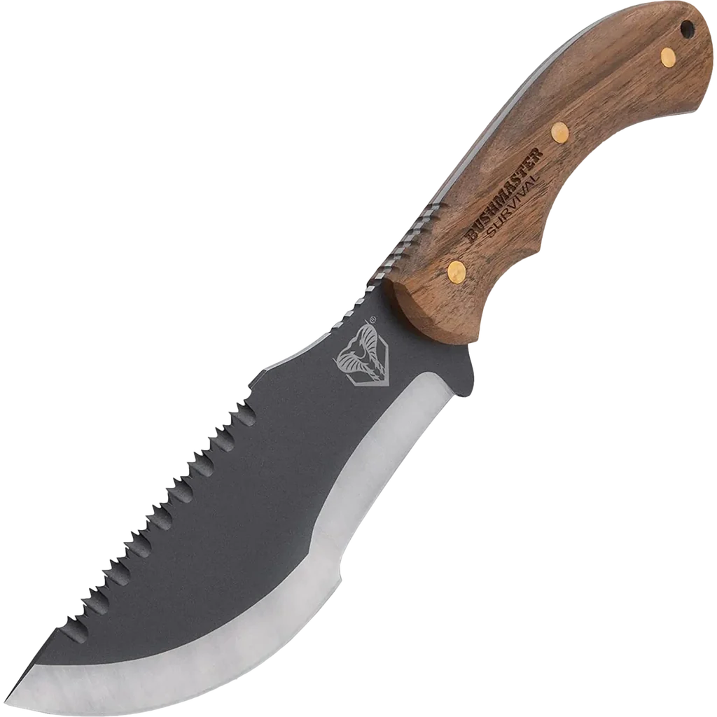 The Bushmaster Tracker Knife will be your right arm when you're out tracking your quarry in the wild. The knife has a 5 7/8", razor-sharp 1095 high carbon steel blade with a sawback and thumb jimping. The comfortably curved wooden handle scales are secured with brass pins and feature thumb jimping. The 11 3/4" overall fixed blade can be carried in its premium leather belt sheath and it also features a lanyard hole.