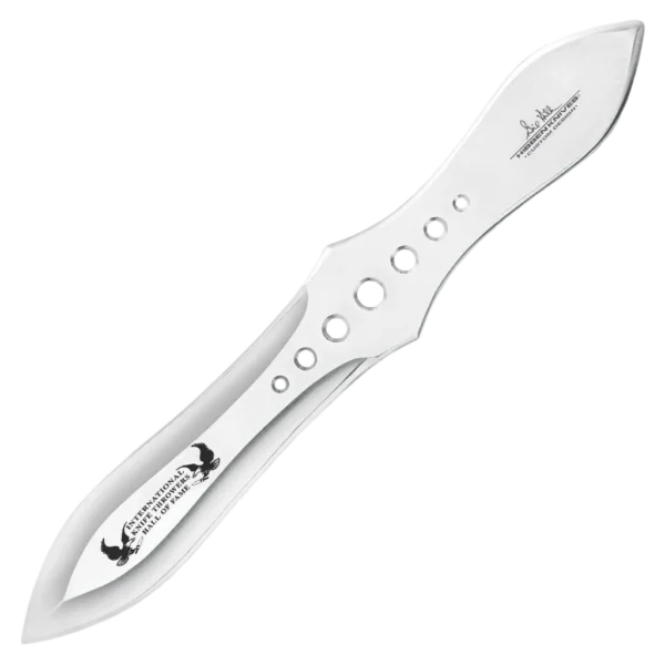 Each of the three Competition Pro Throwers is made of a single piece of stainless steel. These throwing knives have a double edged blade area with International Knife Throwers Hall of Fame embellishment, and a drilled handle area with Gil Hibben signature embellishment. A genuine leather sheath and an 18" by 18" paper competition target are included with this United Cutlery Knife Set.